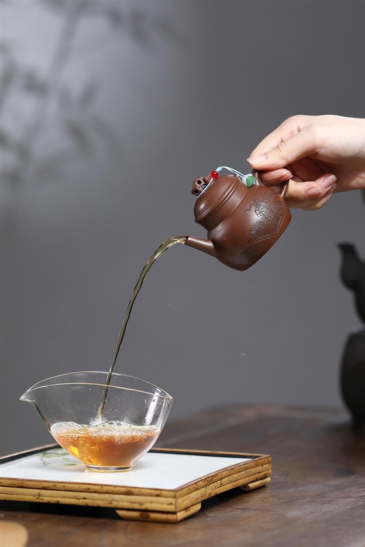 紫砂壺茶壺名家全純手工貼花泥繪原礦清水泥松果花壺POT3916
