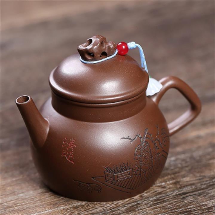 紫砂壺茶壺茶具原礦紫泥手工泥繪喜上眉梢扁晨POT3973