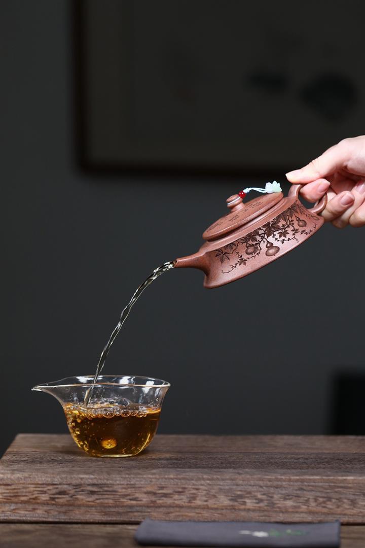【泥料特點】砂土氣重,似淳實農民,日久使用,漸露鋒芒,養成變化,溫潤莊重。紫砂是壹種雙重氣孔結構的多孔性材質,氣孔微細,密度高。用紫砂壺沏茶,不失原味,且香不渙散,得茶之真香真味。紫砂使用越久,壺身色澤越發光亮照人,氣韻溫雅。紫砂壺長久使用器身會因撫摸擦拭,變得越發溫潤光澤。