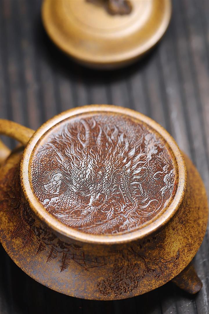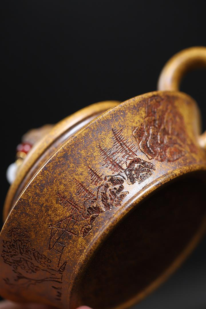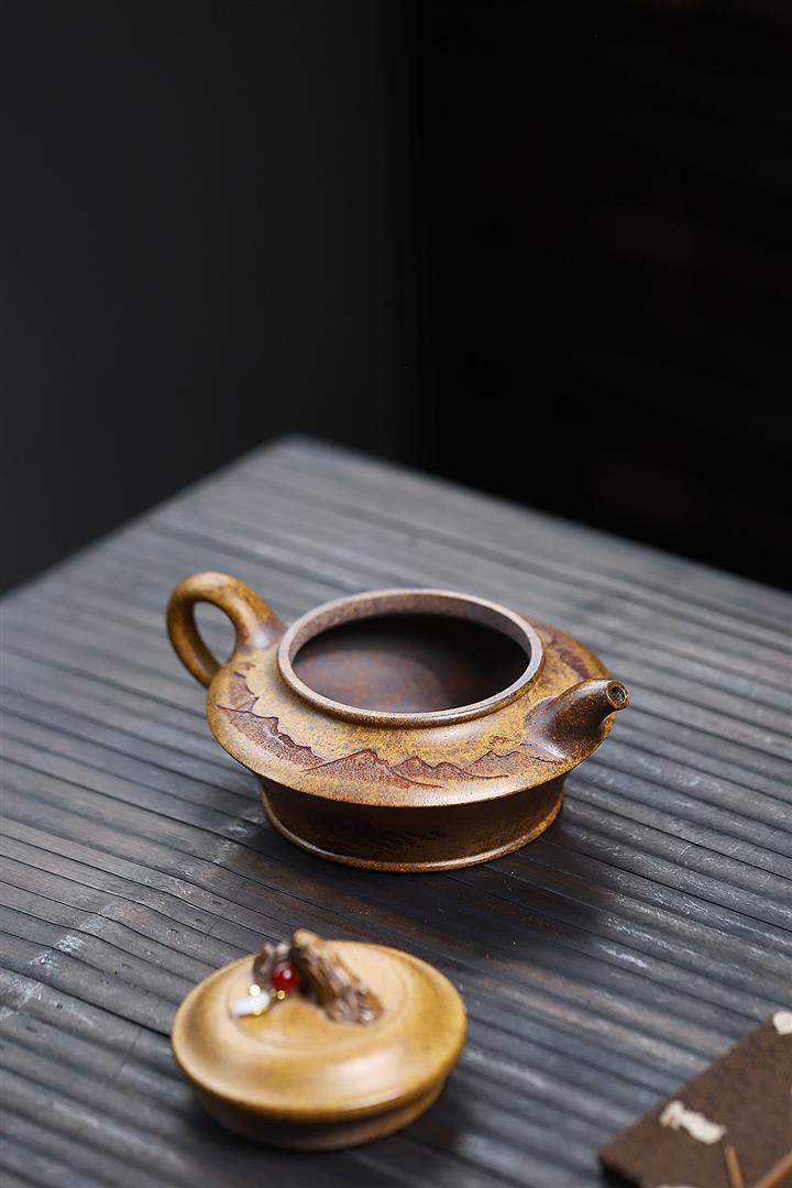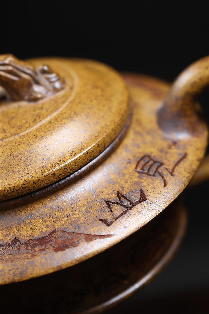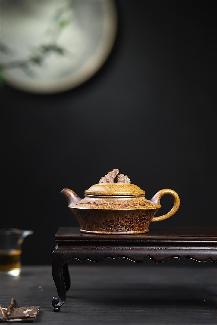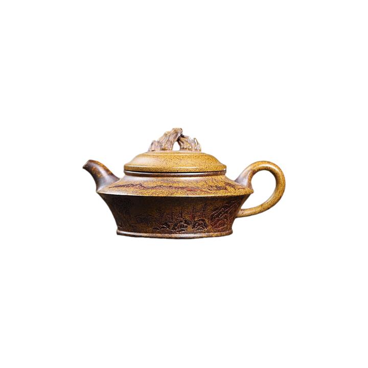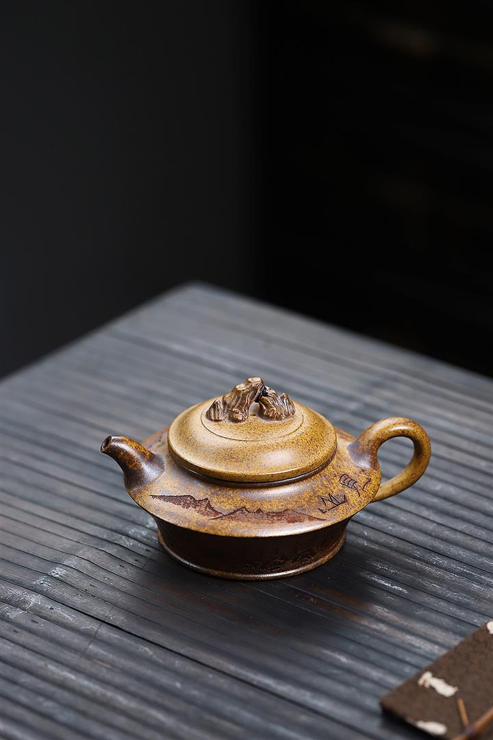 300cc原礦高溫段泥刻繪觀山虛扁茶壺POT8210