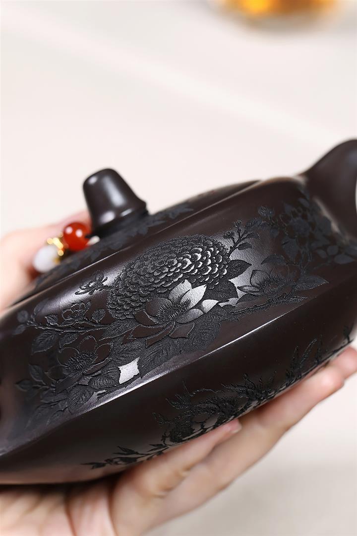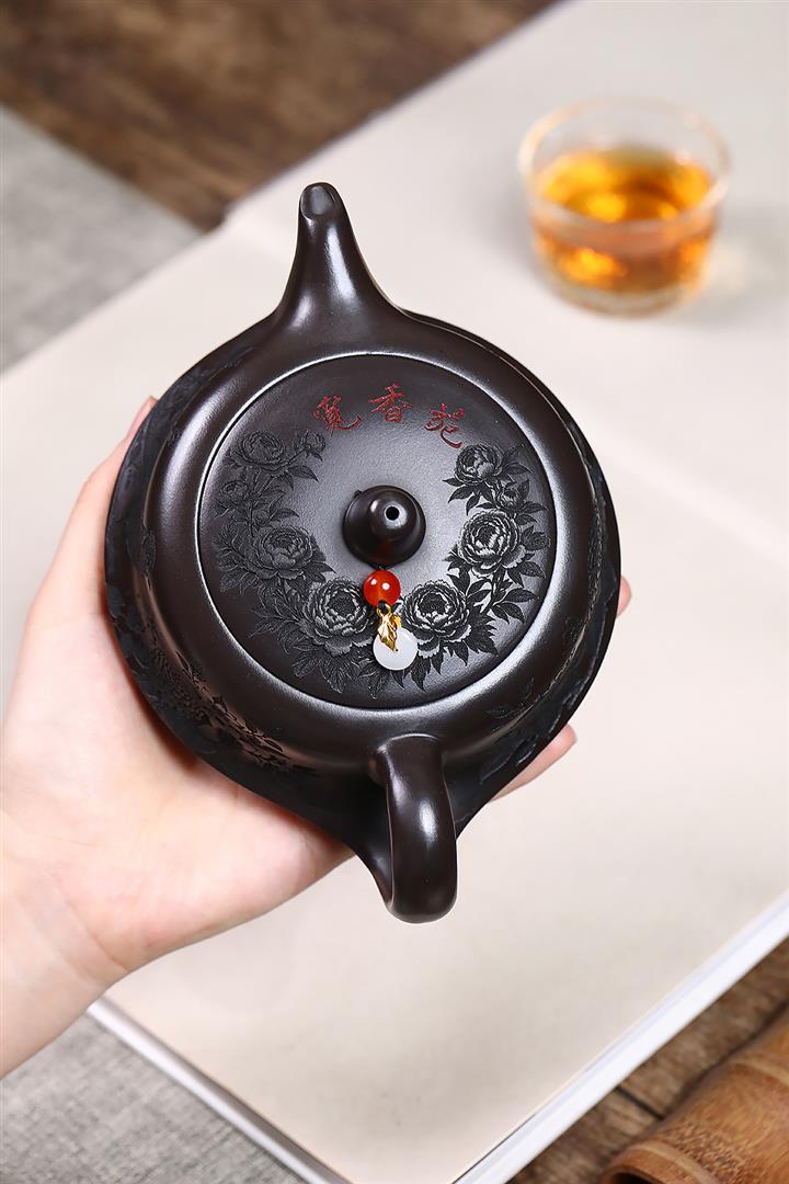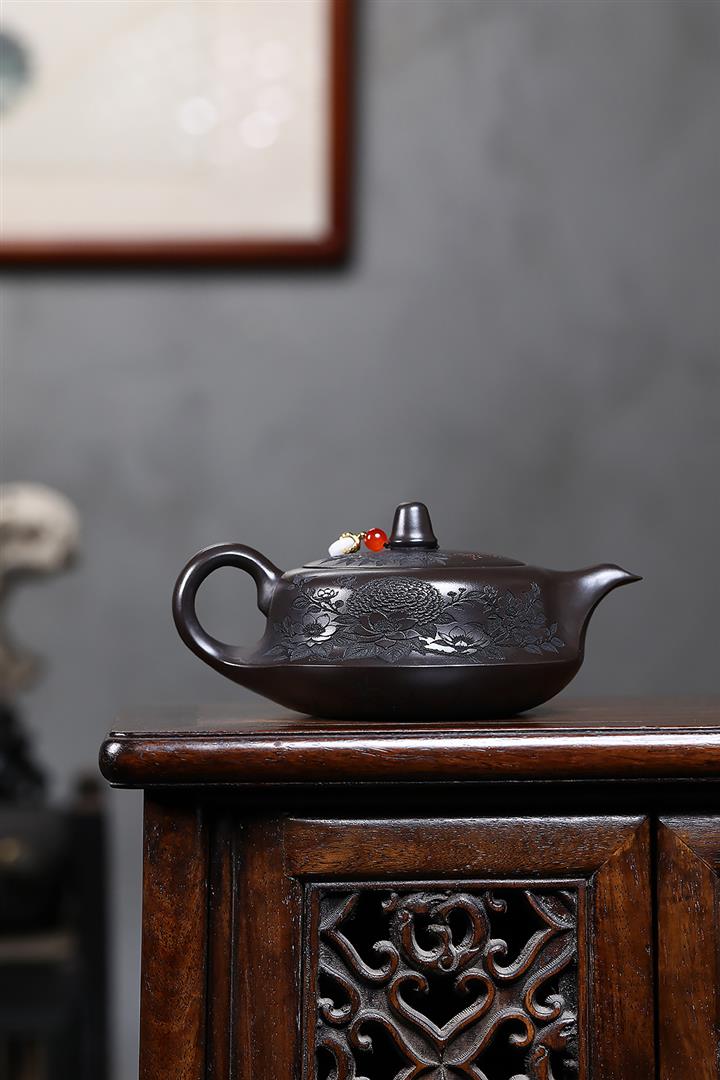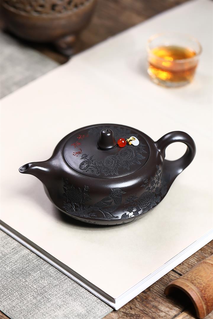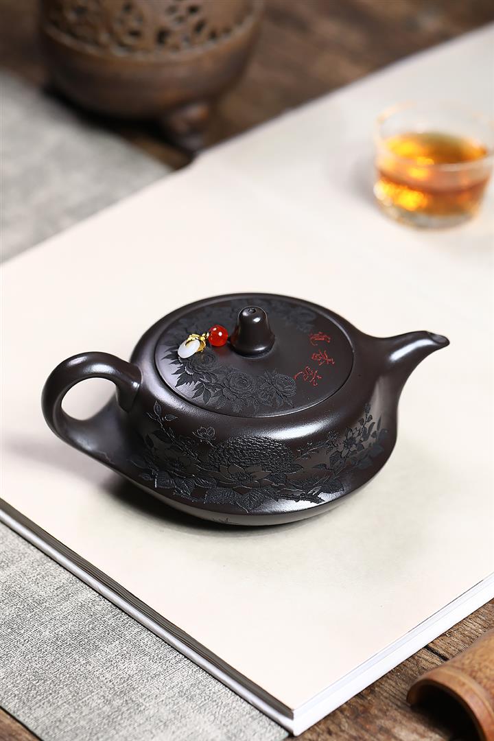 原礦家藏降坡泥滿刻牡丹容天茶壺POT7241