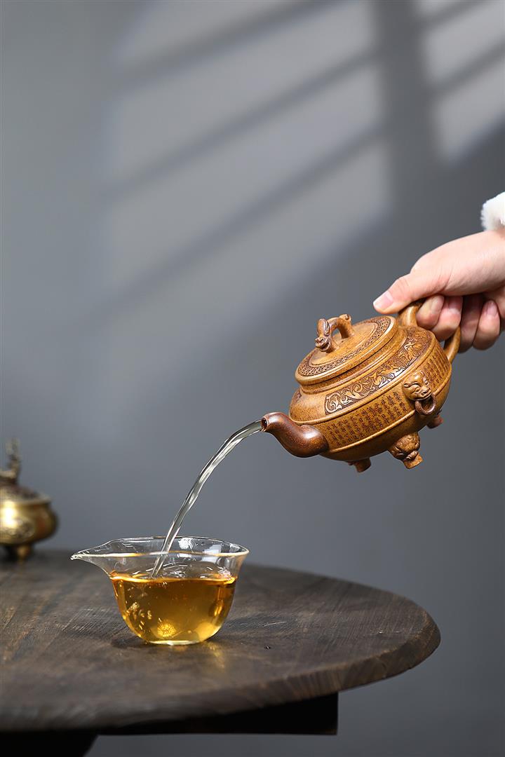【泥料特點】砂土氣重,似淳實農民,日久使用,漸露鋒芒,養成變化,溫潤莊重。紫砂是壹種雙重氣孔結構的多孔性材質,氣孔微細,密度高。用紫砂壺沏茶,不失原味,且香不渙散,得茶之真香真味。紫砂使用越久,壺身色澤越發光亮照人,氣韻溫雅。紫砂壺長久使用器身會因撫摸擦拭,變得越發溫潤光澤。