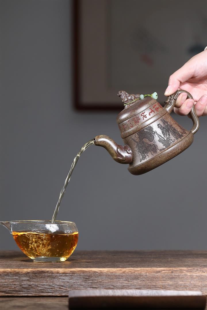 【泥料特點】砂土氣重,似淳實農民,日久使用,漸露鋒芒,養成變化,溫潤莊重。紫砂是壹種雙重氣孔結構的多孔性材質,氣孔微細,密度高。用紫砂壺沏茶,不失原味,且香不渙散,得茶之真香真味。紫砂使用越久,壺身色澤越發光亮照人,氣韻溫雅。紫砂壺長久使用器身會因撫摸擦拭,變得越發溫潤光澤。