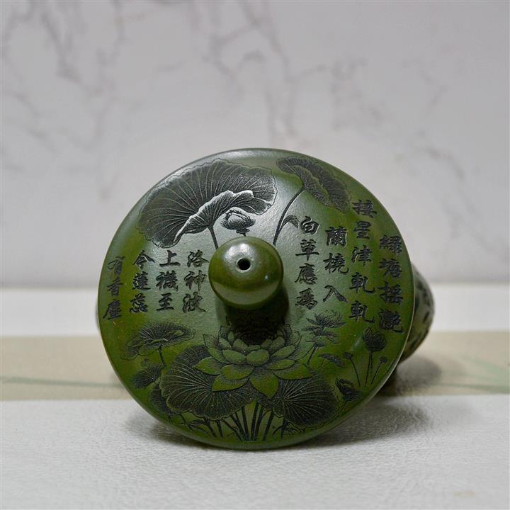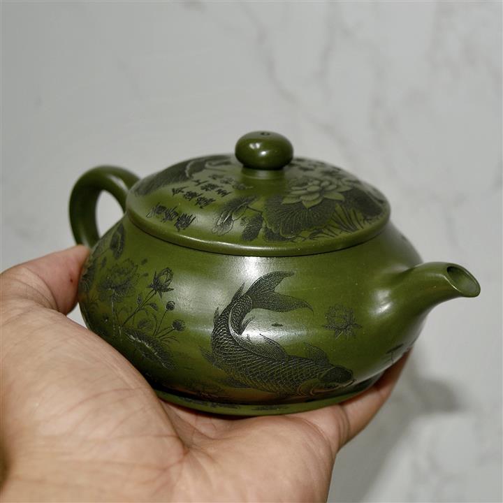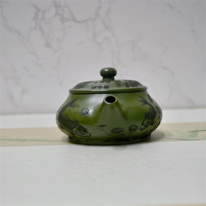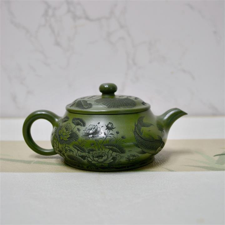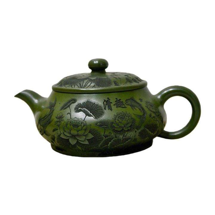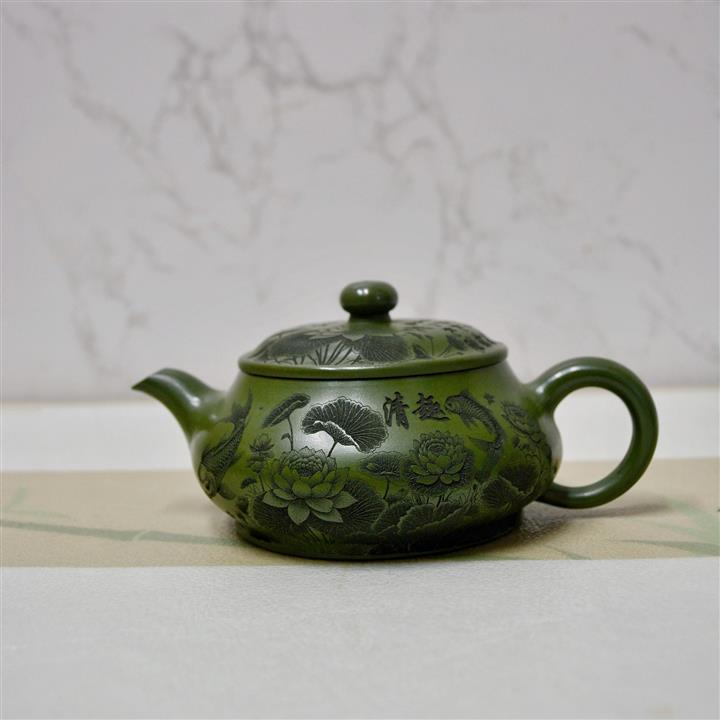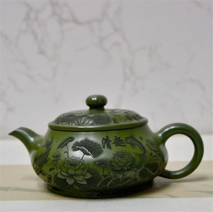 220cc原礦綠泥刻繪荷趣明爐茶壺POT8498