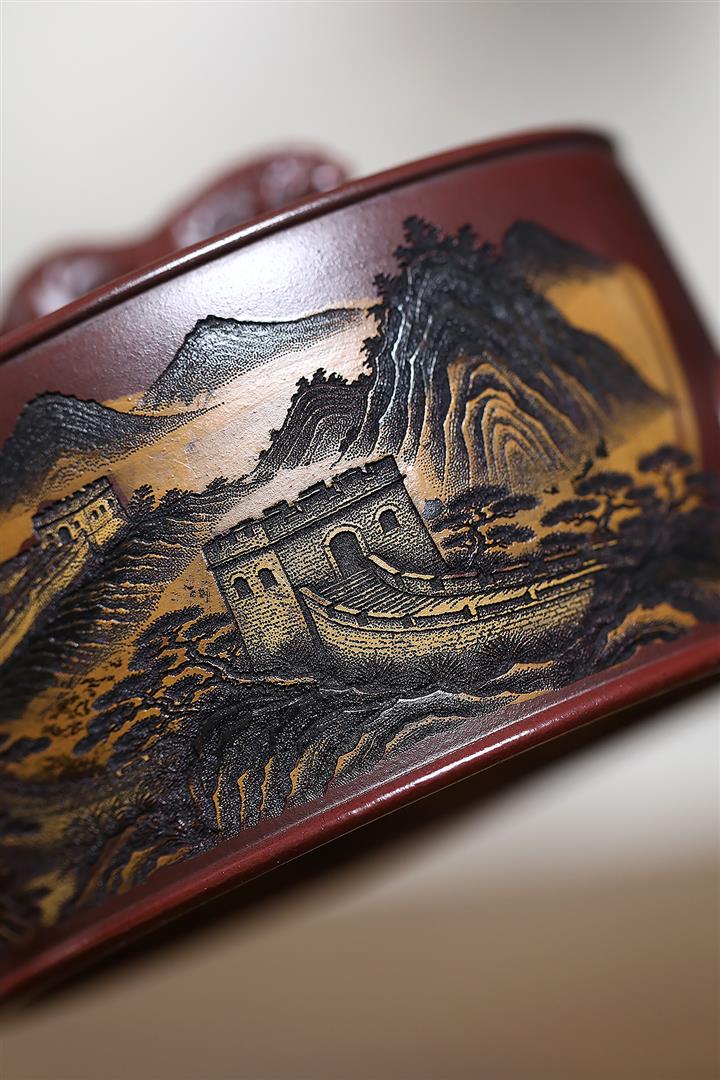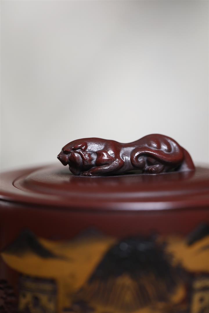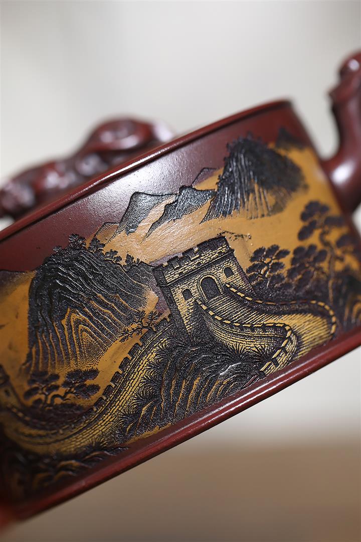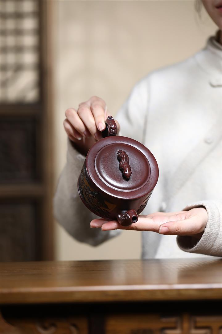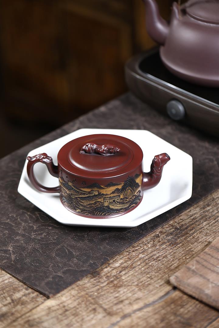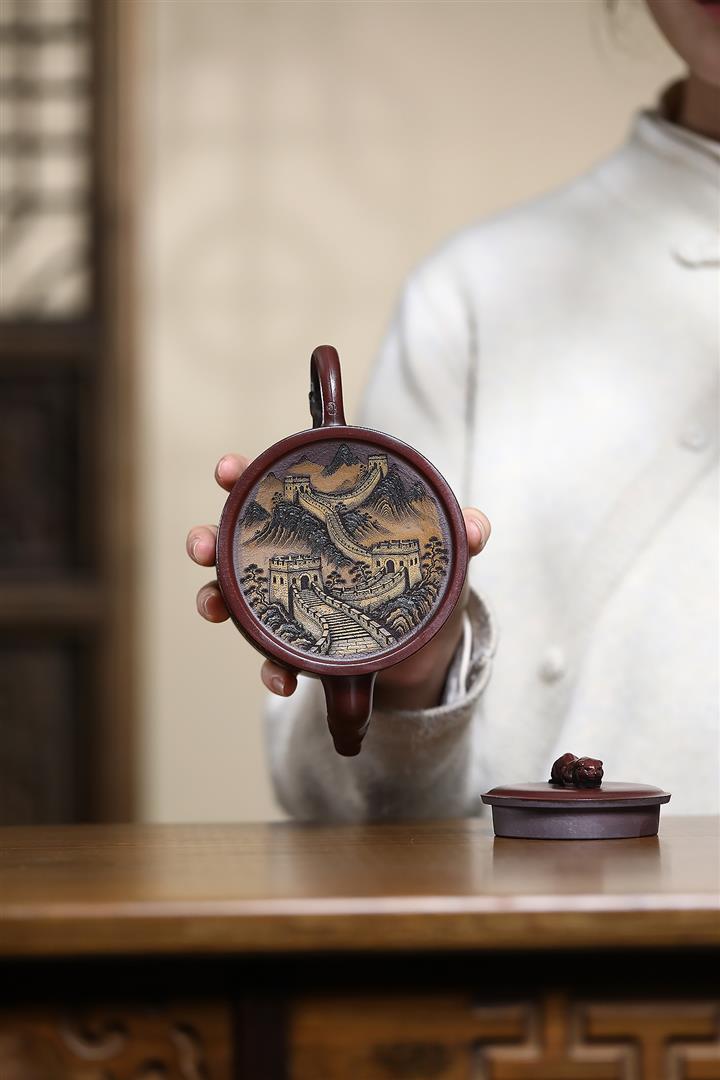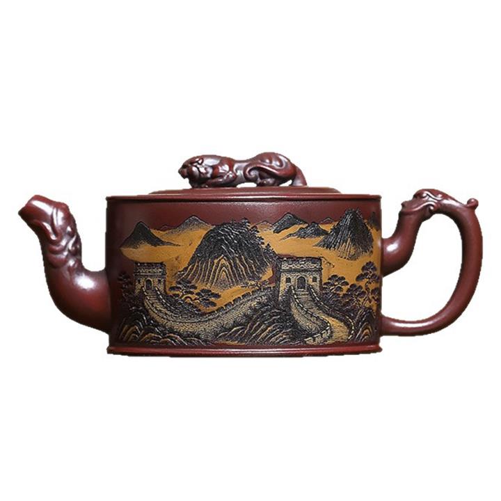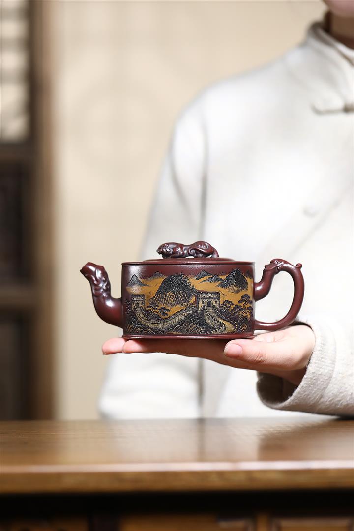 320cc原礦古烏泥萬裏長城彩刻伏虎茶壺POT8723