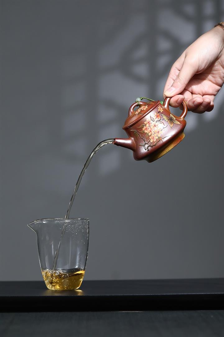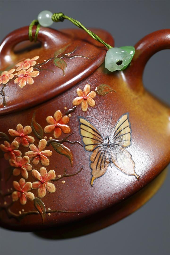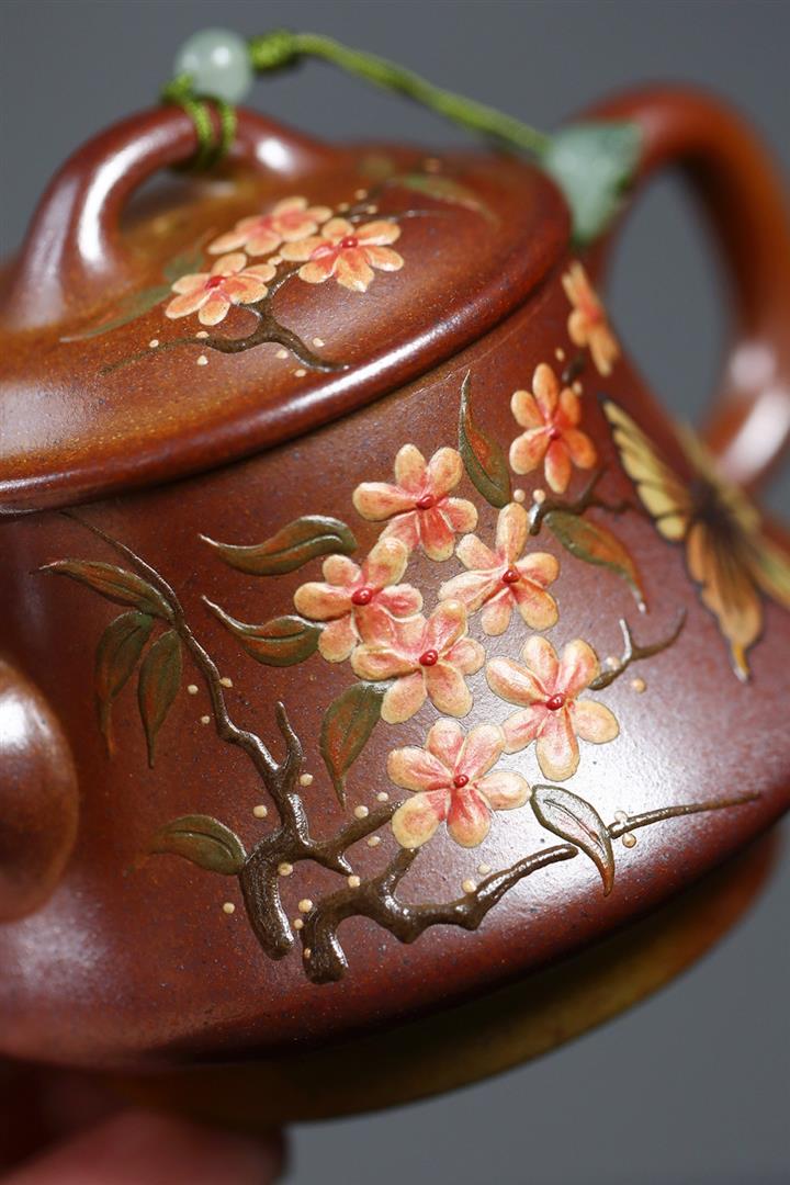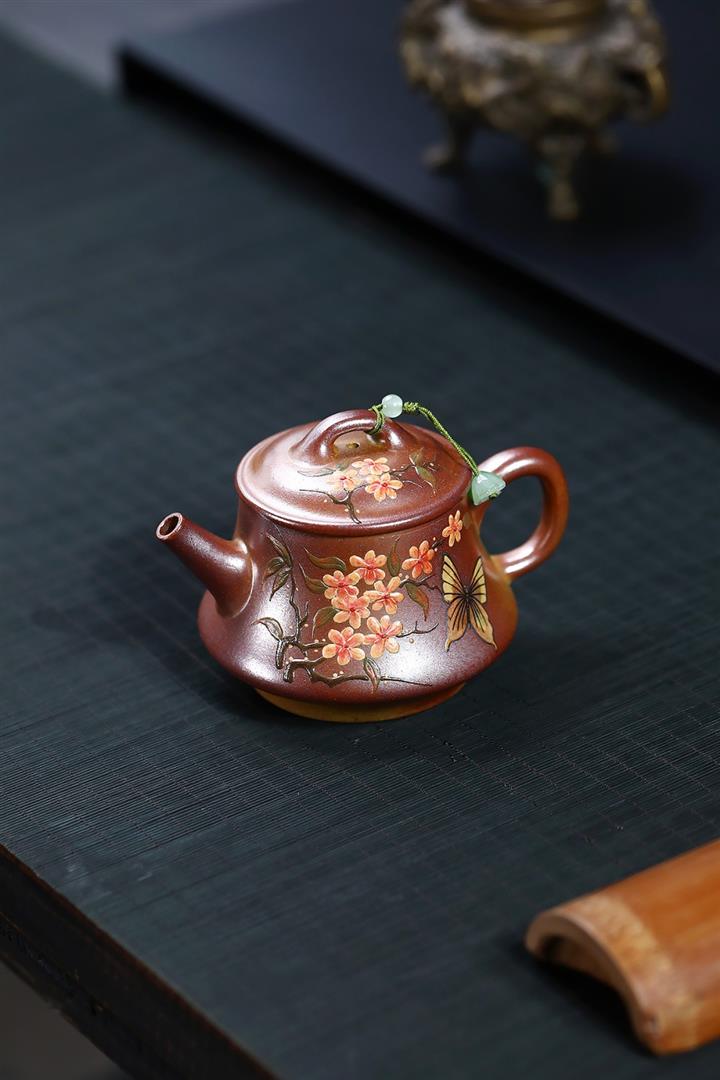 【泥料特點】砂土氣重,似淳實農民,日久使用,漸露鋒芒,養成變化,溫潤莊重。紫砂是壹種雙重氣孔結構的多孔性材質,氣孔微細,密度高。用紫砂壺沏茶,不失原味,且香不渙散,得茶之真香真味。紫砂使用越久,壺身色澤越發光亮照人,氣韻溫雅。紫砂壺長久使用器身會因撫摸擦拭,變得越發溫潤光澤。