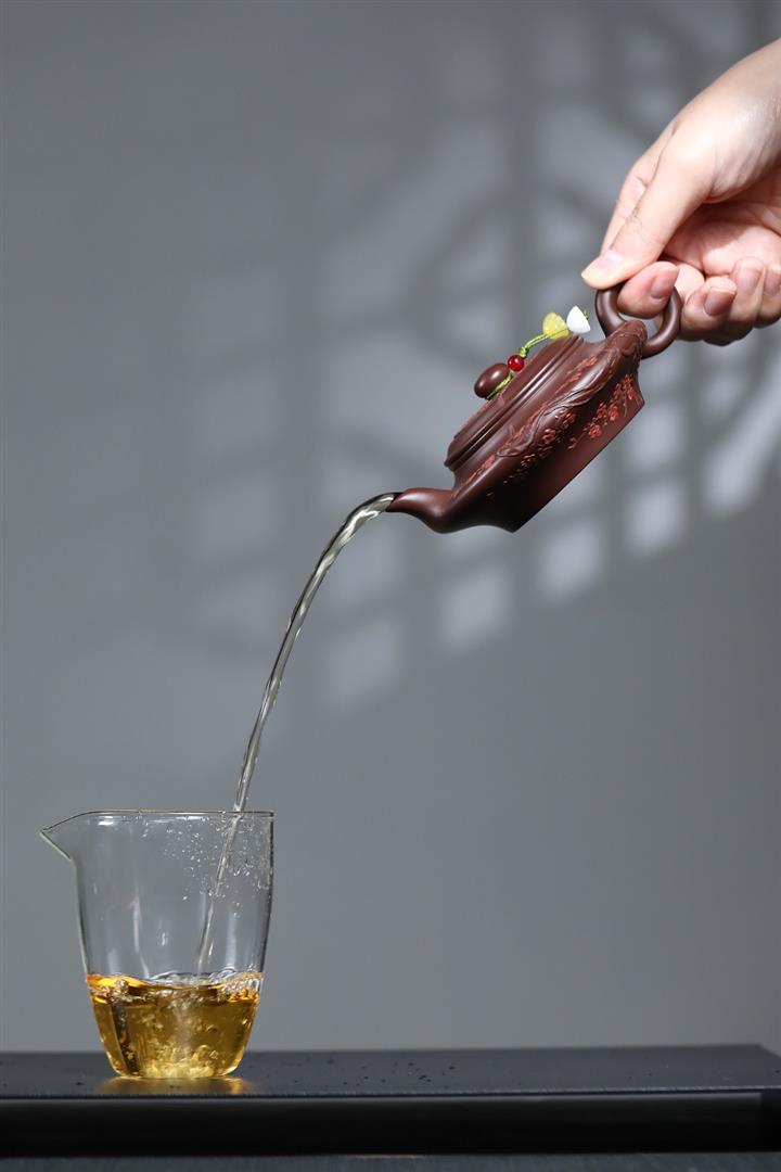 【泥料特點】砂土氣重,似淳實農民,日久使用,漸露鋒芒,養成變化,溫潤莊重。紫砂是壹種雙重氣孔結構的多孔性材質,氣孔微細,密度高。用紫砂壺沏茶,不失原味,且香不渙散,得茶之真香真味。紫砂使用越久,壺身色澤越發光亮照人,氣韻溫雅。紫砂壺長久使用器身會因撫摸擦拭,變得越發溫潤光澤。