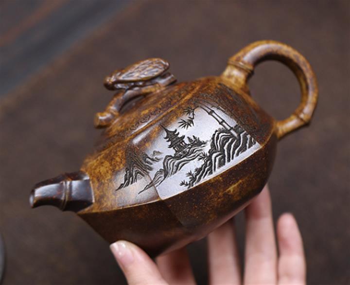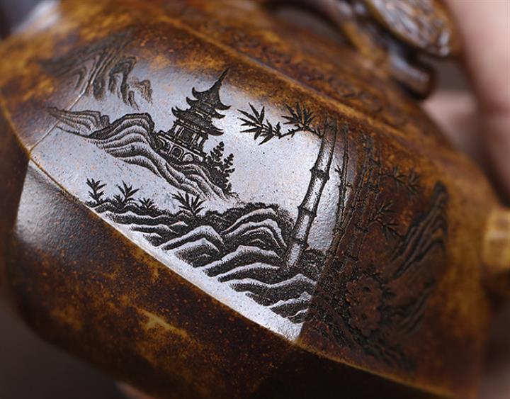 原礦紫泥山水四方壺POT4372