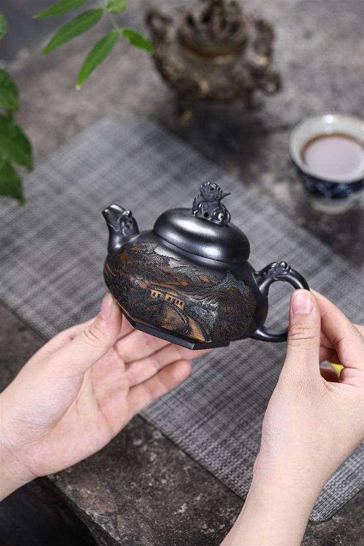 紫砂壺純全手工刻繪原礦紫泥寒香漁翁茶壺小毫升茶具130毫升pot3864