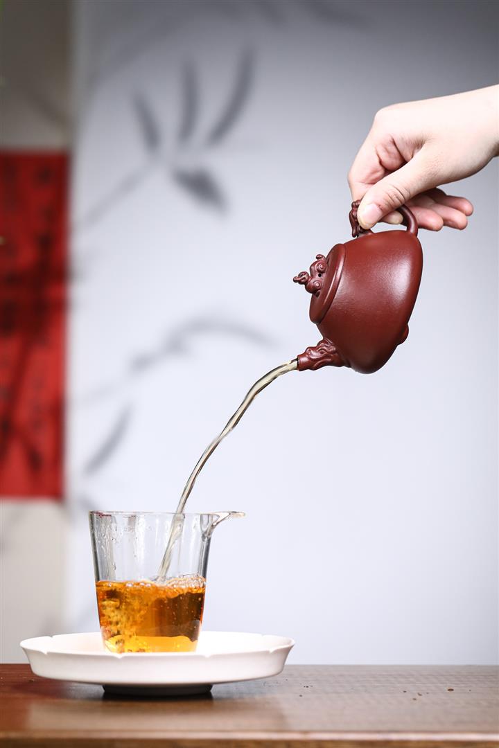【泥料特點】砂土氣重,似淳實農民,日久使用,漸露鋒芒,養成變化,溫潤莊重。紫砂是壹種雙重氣孔結構的多孔性材質,氣孔微細,密度高。用紫砂壺沏茶,不失原味,且香不渙散,得茶之真香真味。紫砂使用越久,壺身色澤越發光亮照人,氣韻溫雅。紫砂壺長久使用器身會因撫摸擦拭,變得越發溫潤光澤。