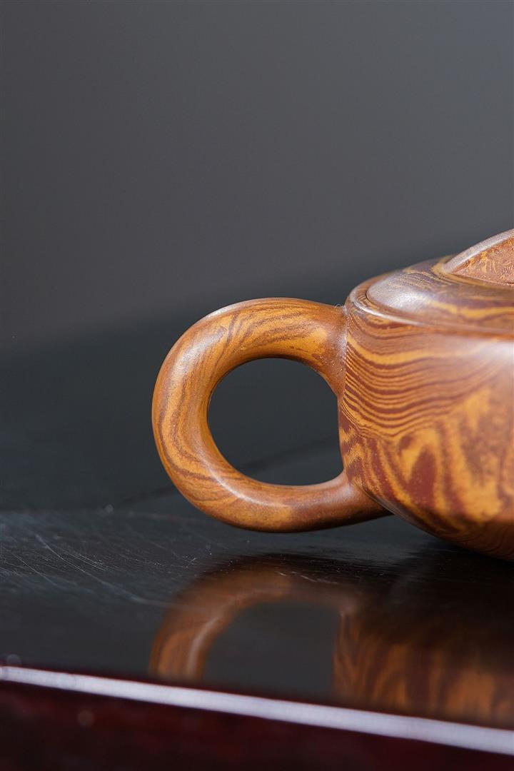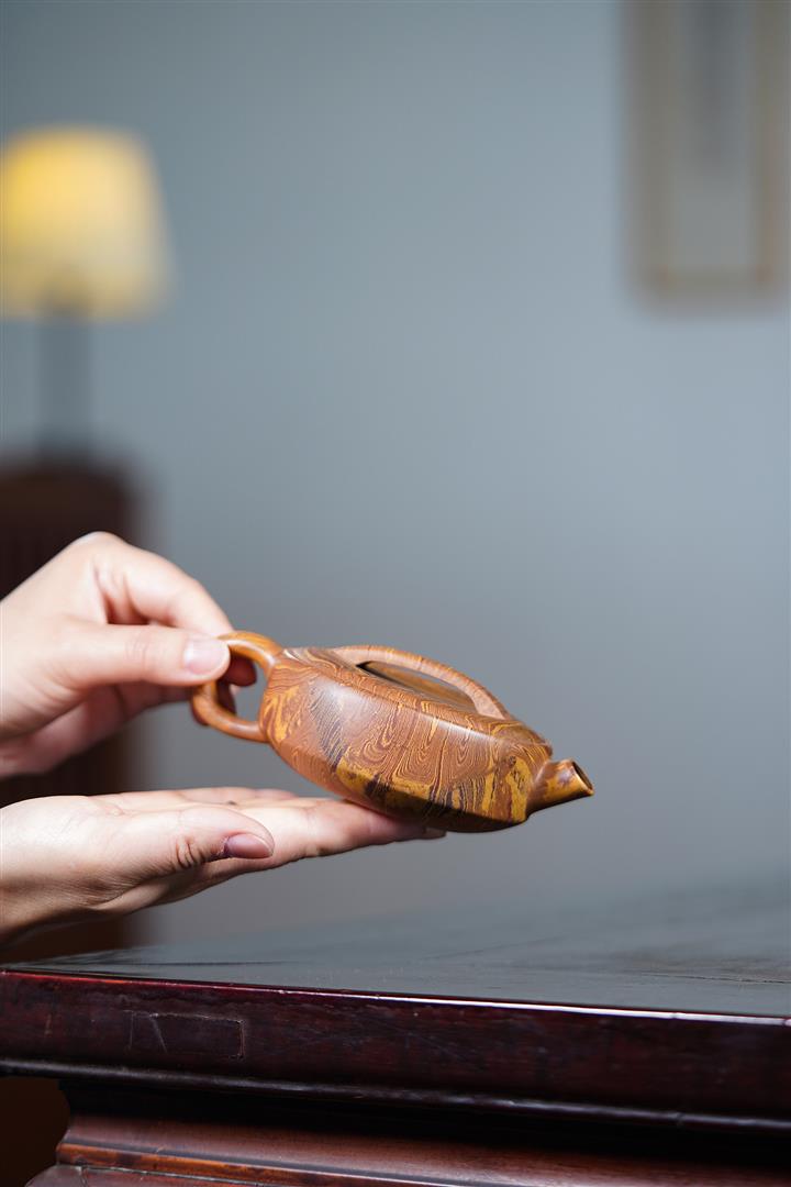 【泥料特點】砂土氣重,似淳實農民,日久使用,漸露鋒芒,養成變化,溫潤莊重。紫砂是壹種雙重氣孔結構的多孔性材質,氣孔微細,密度高。用紫砂壺沏茶,不失原味,且香不渙散,得茶之真香真味。紫砂使用越久,壺身色澤越發光亮照人,氣韻溫雅。紫砂壺長久使用器身會因撫摸擦拭,變得越發溫潤光澤。