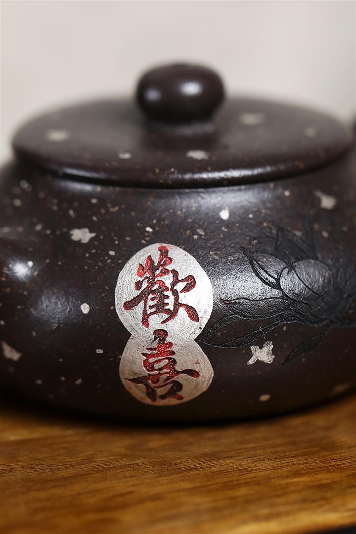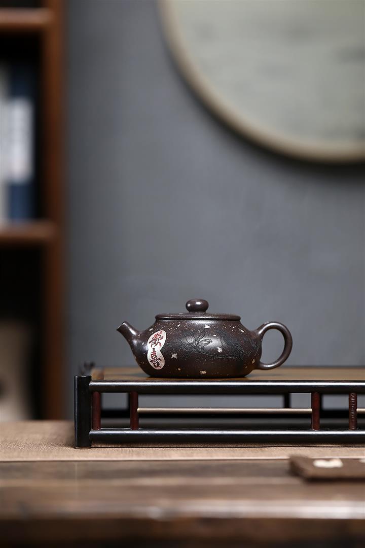 150cc原礦描銀鋪砂雪花紫泥扁柿茶壺POT9042