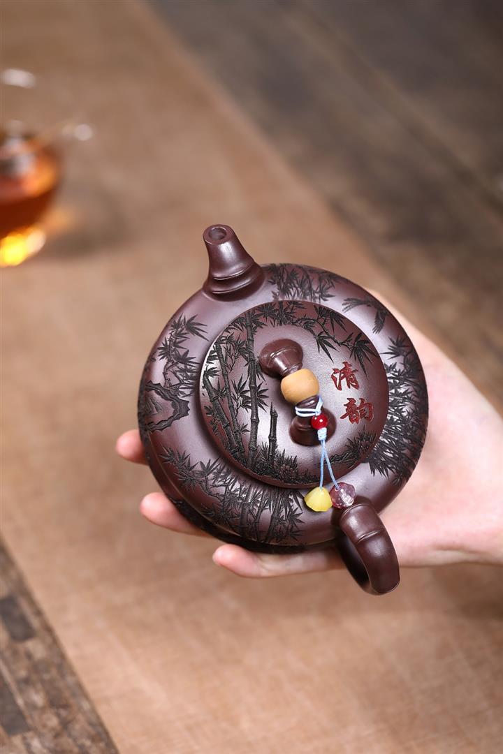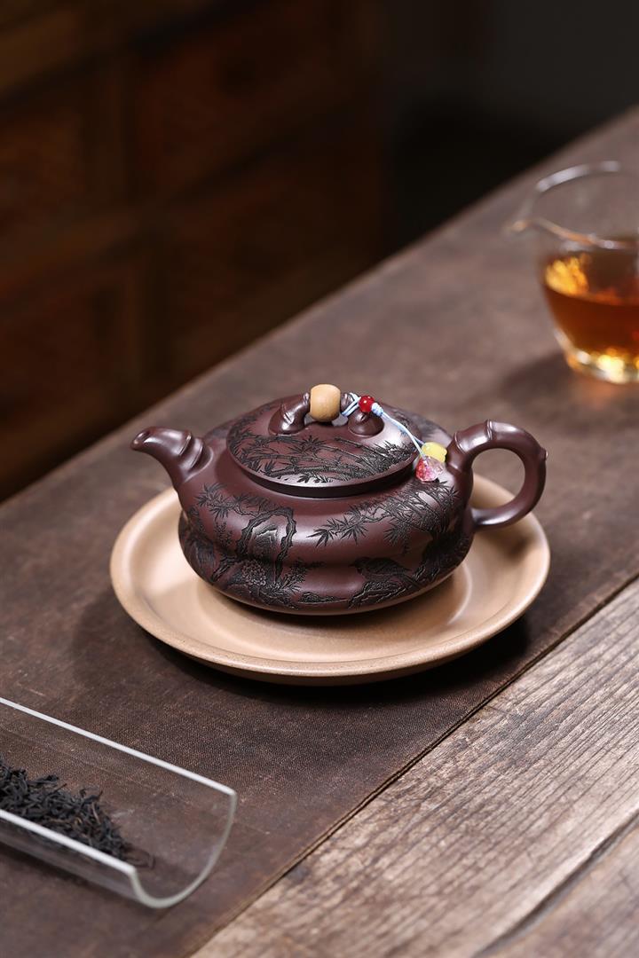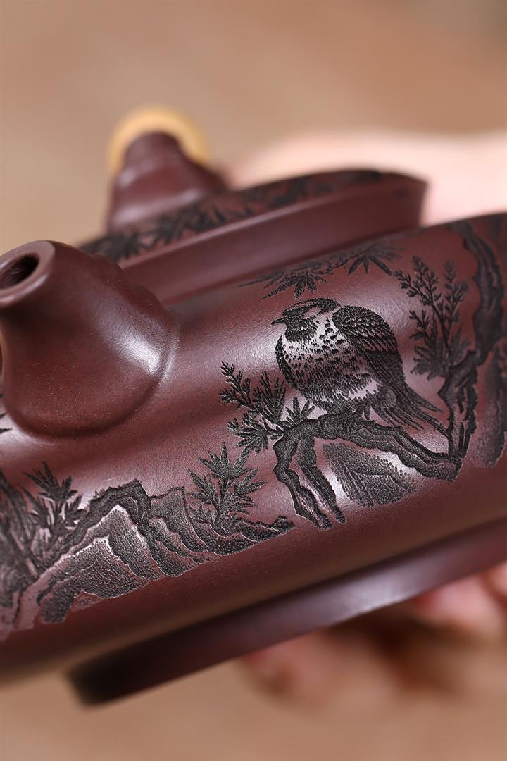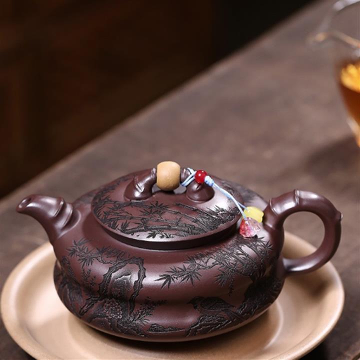400cc原礦清水泥陶刻松影曲梁提梁茶壺POT8753