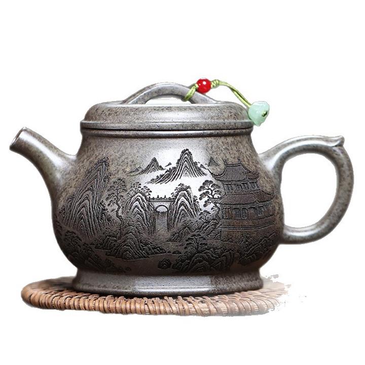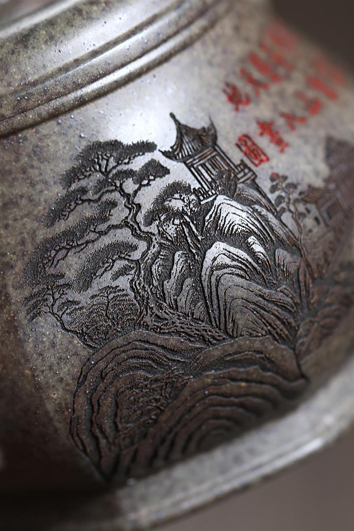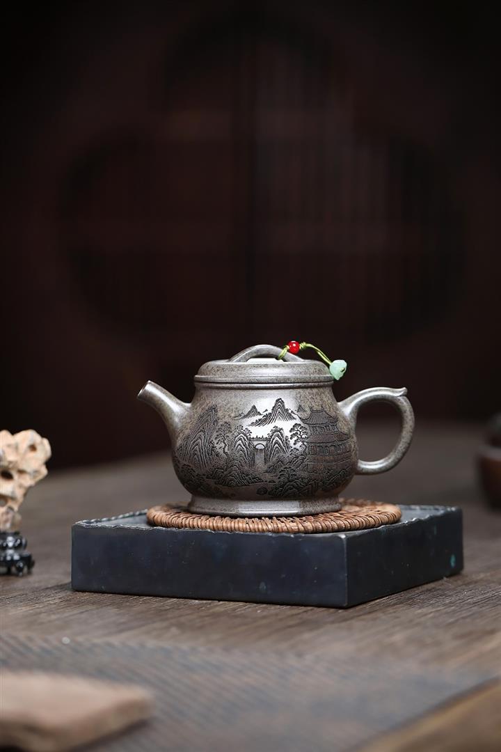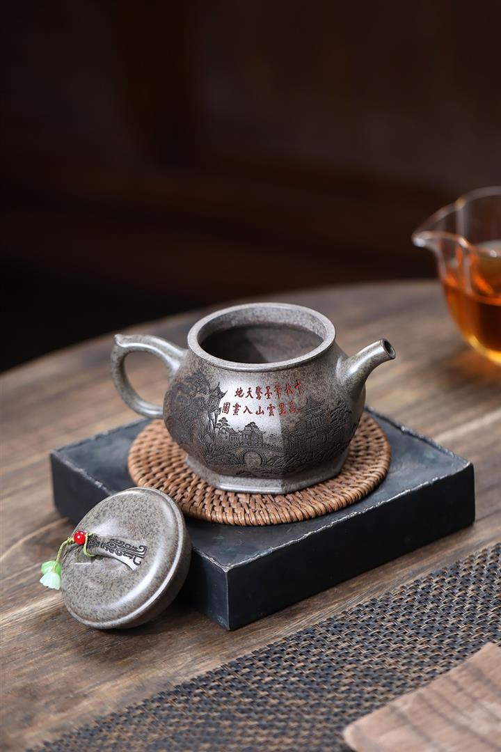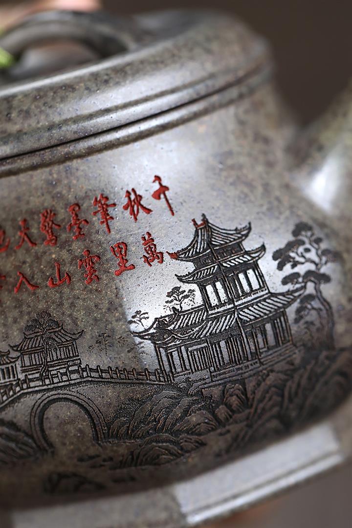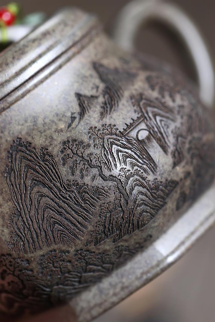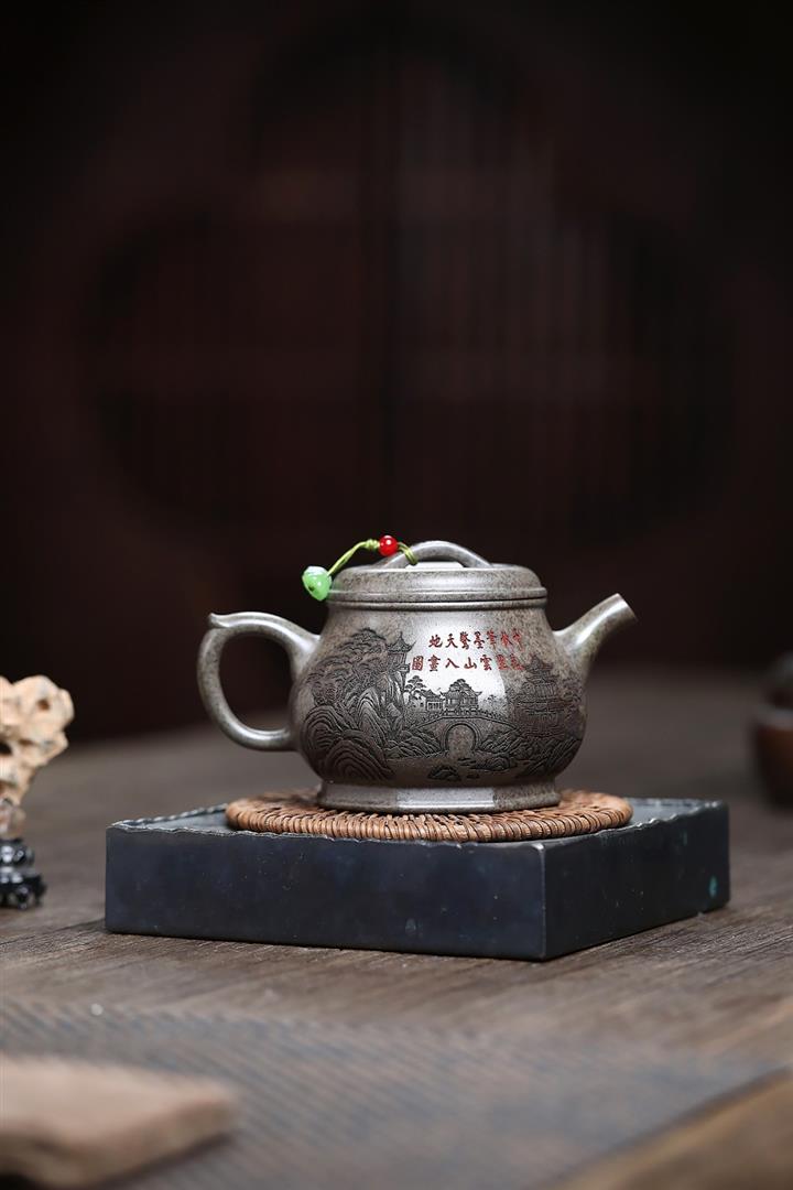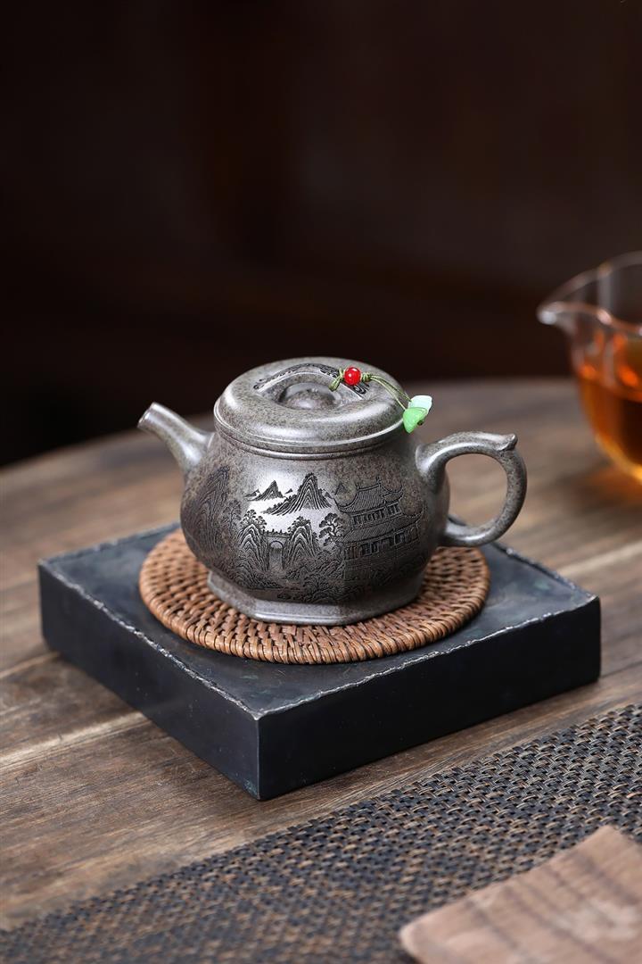 220cc原礦綠泥刻繪荷趣明爐茶壺POT8498