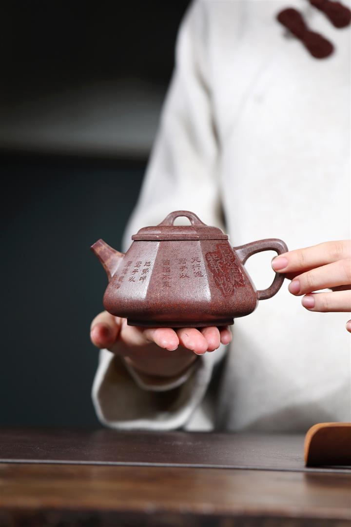 【泥料特點】砂土氣重,似淳實農民,日久使用,漸露鋒芒,養成變化,溫潤莊重。紫砂是壹種雙重氣孔結構的多孔性材質,氣孔微細,密度高。用紫砂壺沏茶,不失原味,且香不渙散,得茶之真香真味。紫砂使用越久,壺身色澤越發光亮照人,氣韻溫雅。紫砂壺長久使用器身會因撫摸擦拭,變得越發溫潤光澤。