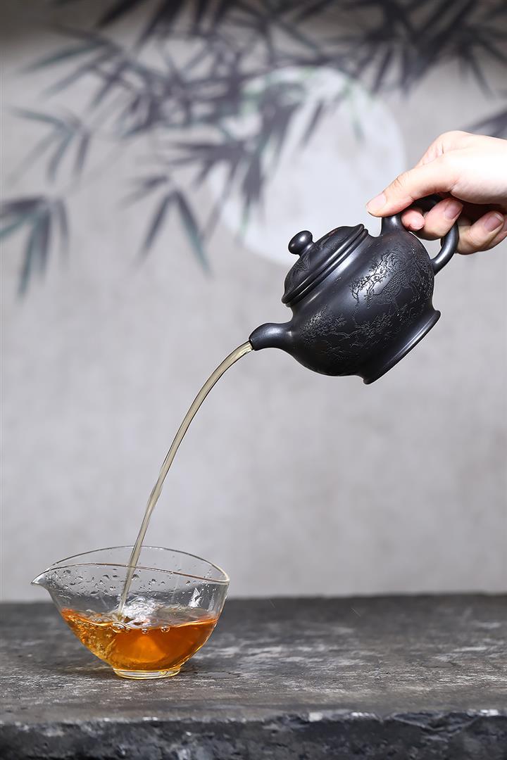 【泥料特點】砂土氣重,似淳實農民,日久使用,漸露鋒芒,養成變化,溫潤莊重。紫砂是壹種雙重氣孔結構的多孔性材質,氣孔微細,密度高。用紫砂壺沏茶,不失原味,且香不渙散,得茶之真香真味。紫砂使用越久,壺身色澤越發光亮照人,氣韻溫雅。紫砂壺長久使用器身會因撫摸擦拭,變得越發溫潤光澤。