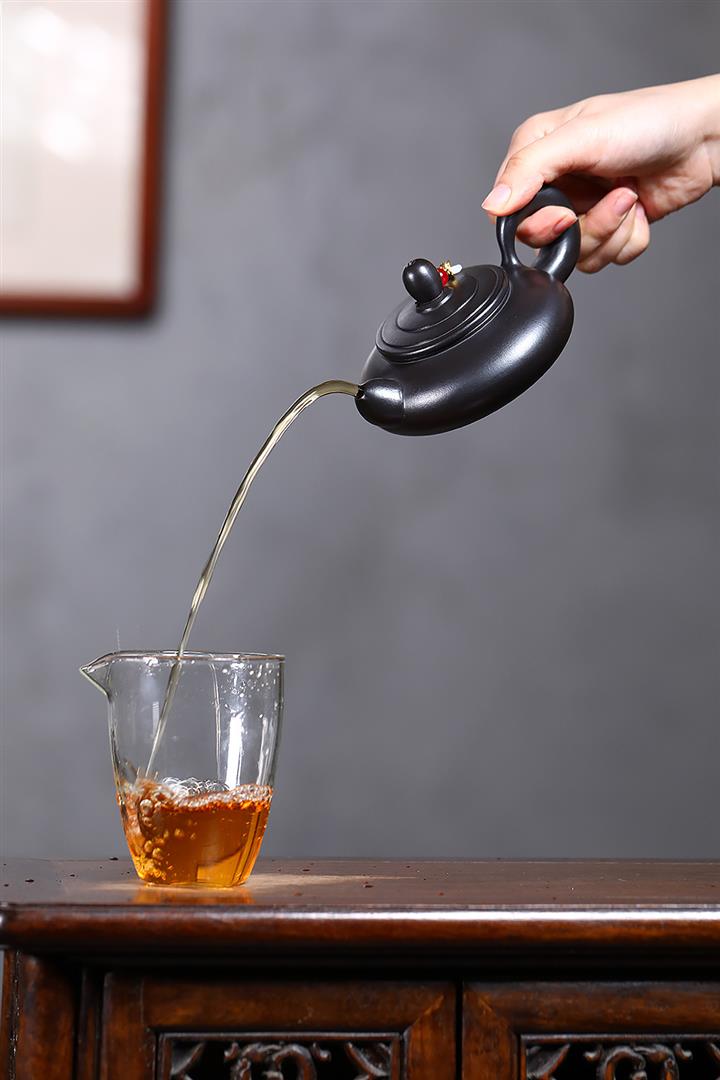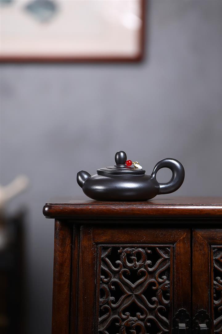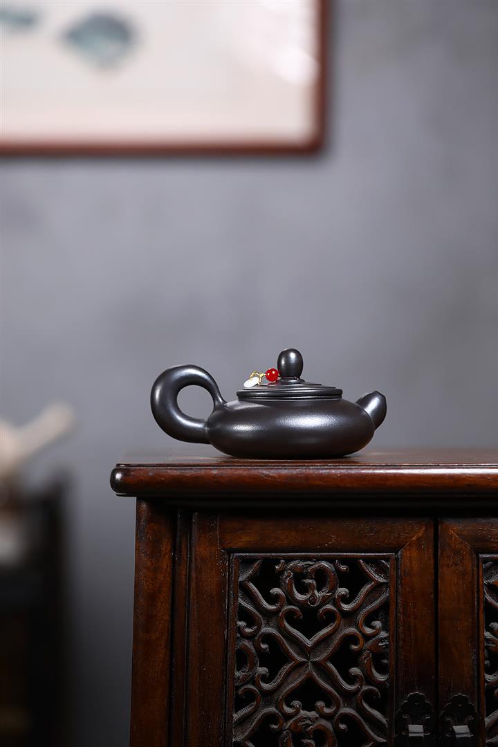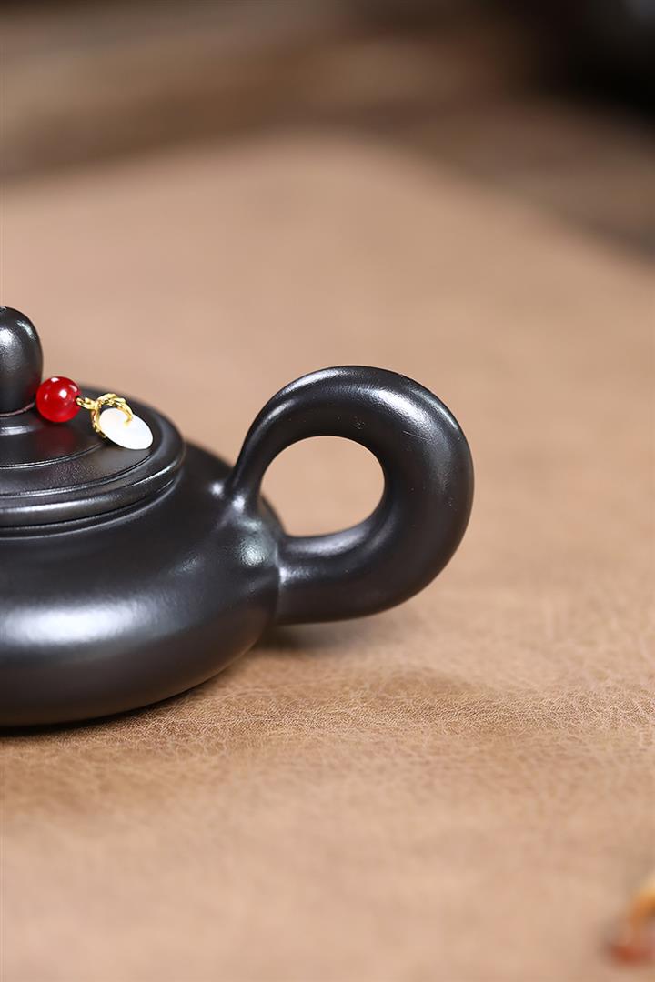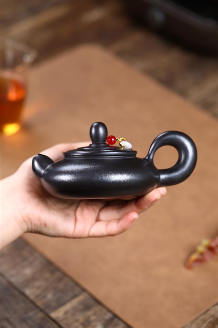 原礦黑朱泥牡丹扁腹家用茶壺紫砂壺200cc pot3427