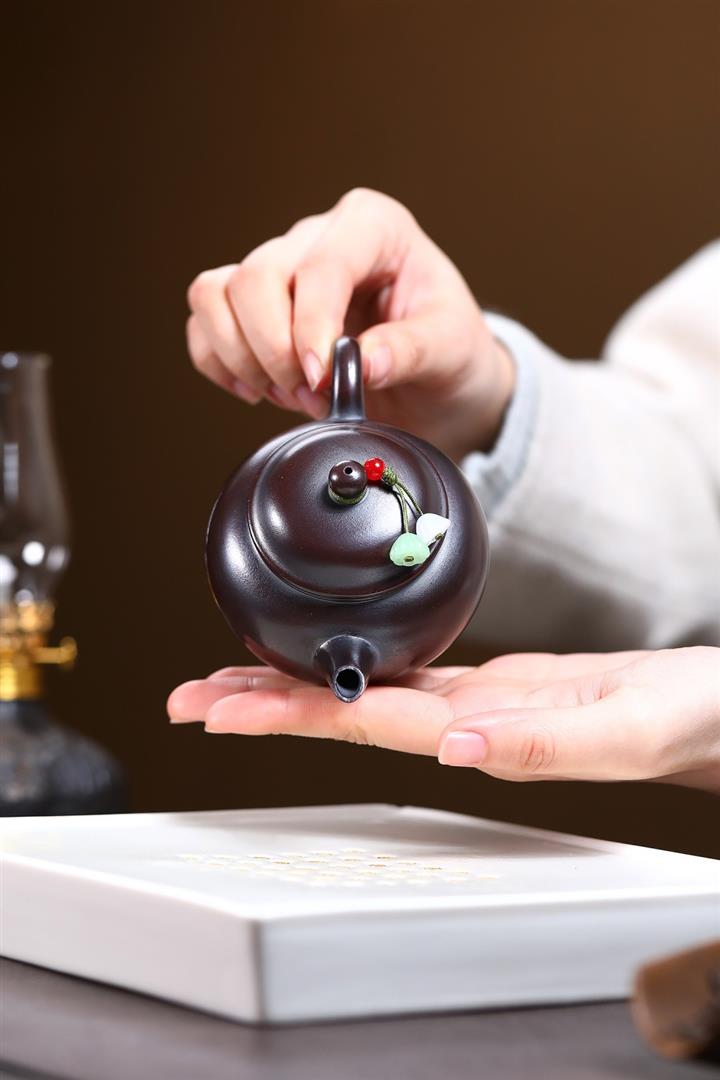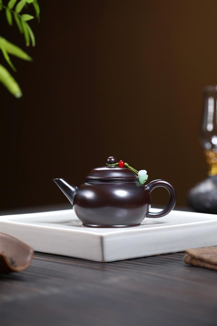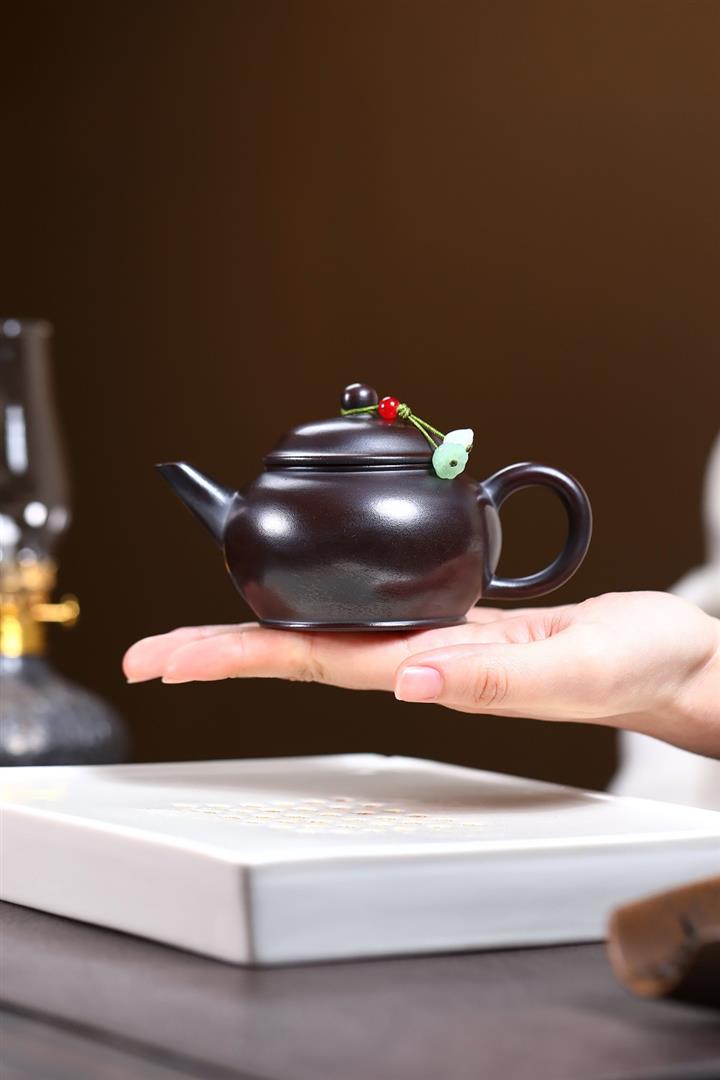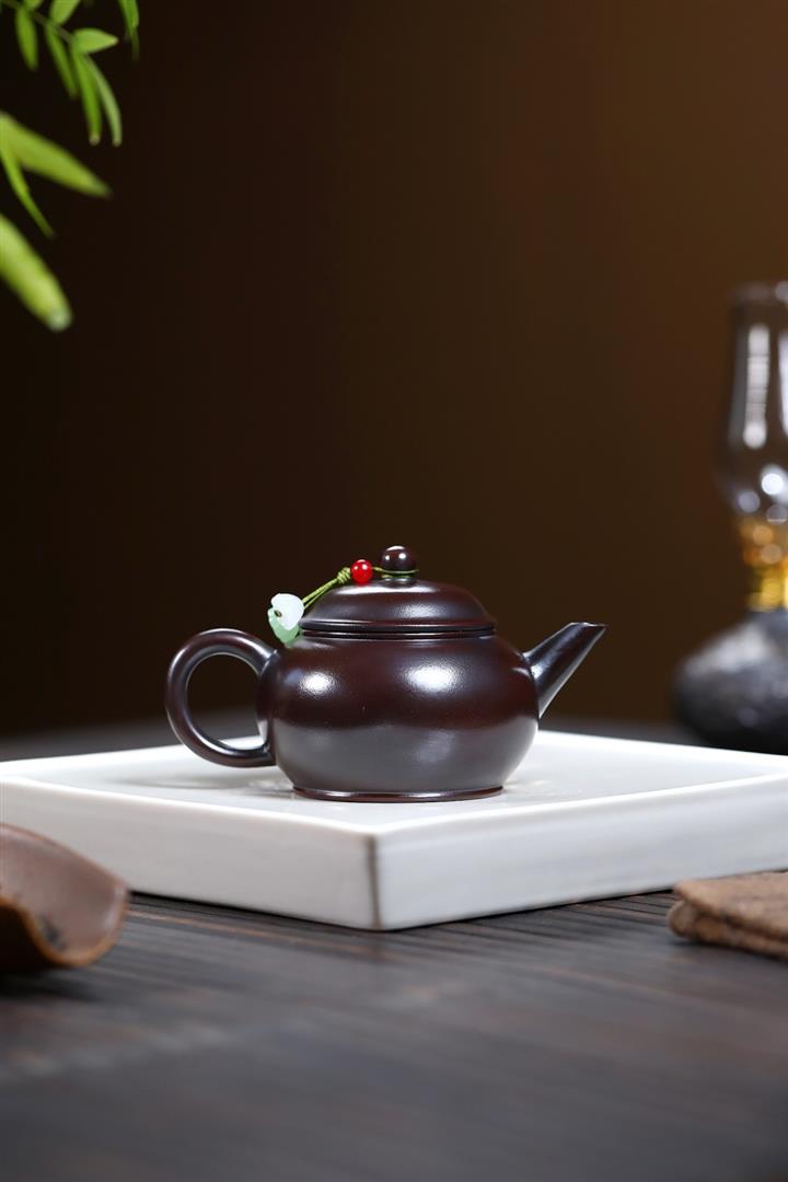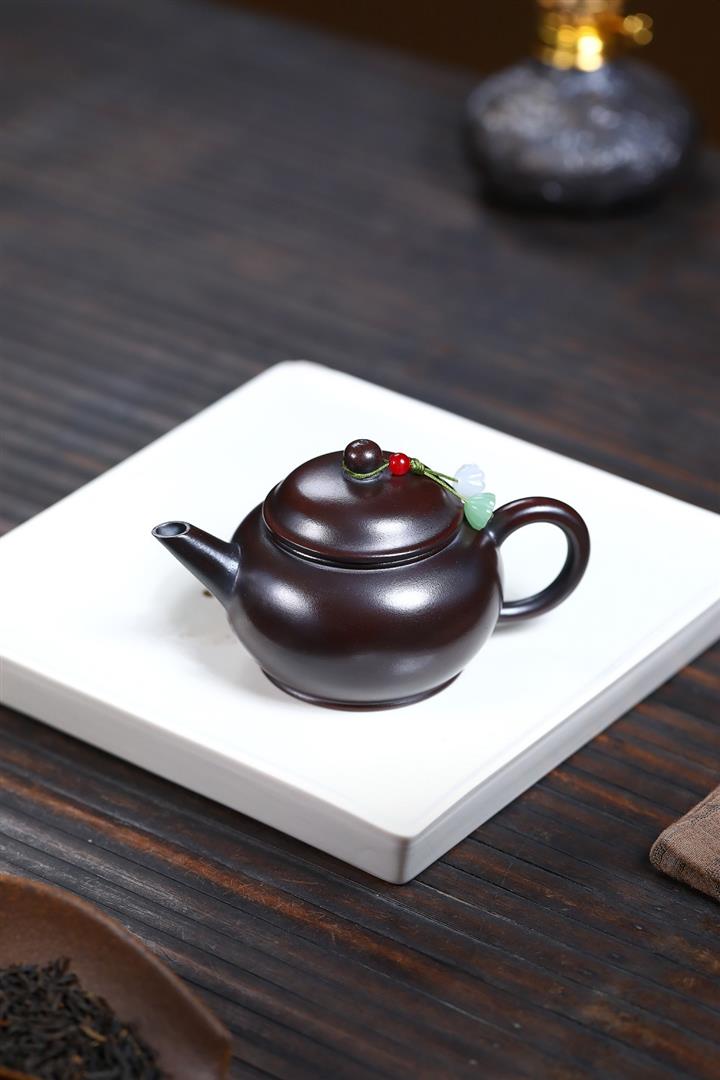 原礦黑朱泥牡丹扁腹家用茶壺紫砂壺200cc pot3427
