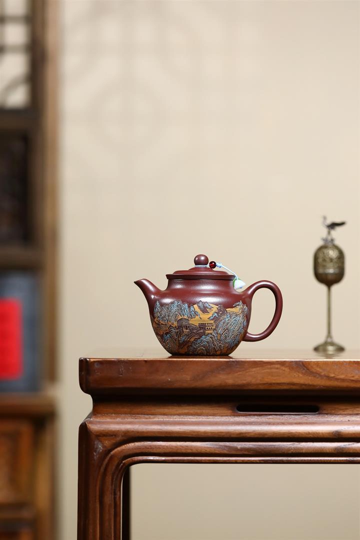 大紅袍還原燒手工半月描銀紫砂壺POT6508