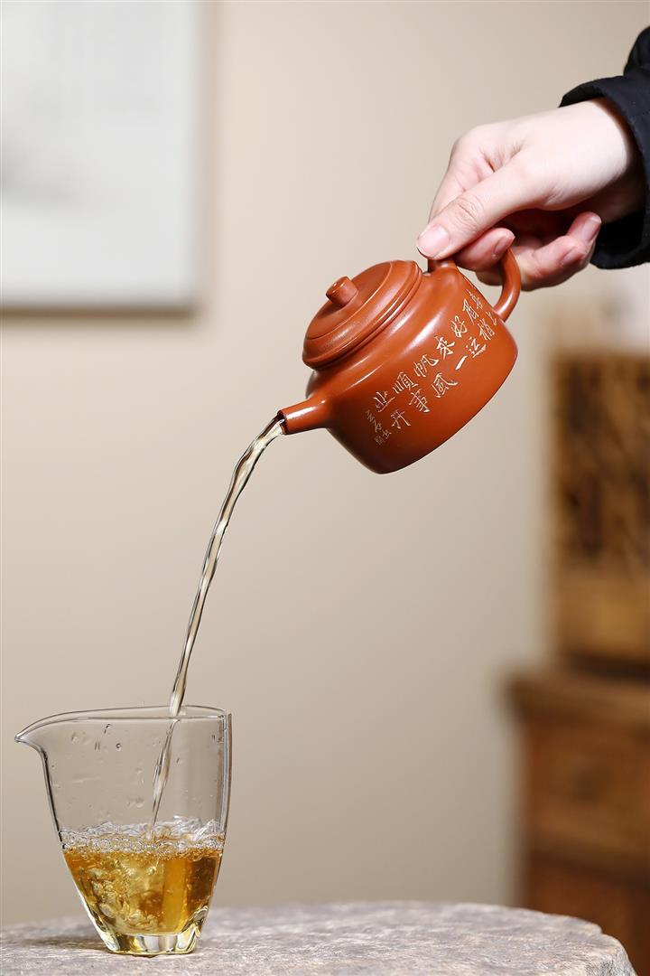 【泥料特點】砂土氣重,似淳實農民,日久使用,漸露鋒芒,養成變化,溫潤莊重。紫砂是壹種雙重氣孔結構的多孔性材質,氣孔微細,密度高。用紫砂壺沏茶,不失原味,且香不渙散,得茶之真香真味。紫砂使用越久,壺身色澤越發光亮照人,氣韻溫雅。紫砂壺長久使用器身會因撫摸擦拭,變得越發溫潤光澤。