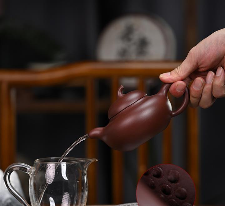 【泥料特點】砂土氣重,似淳實農民,日久使用,漸露鋒芒,養成變化,溫潤莊重。紫砂是壹種雙重氣孔結構的多孔性材質,氣孔微細,密度高。用紫砂壺沏茶,不失原味,且香不渙散,得茶之真香真味。紫砂使用越久,壺身色澤越發光亮照人,氣韻溫雅。紫砂壺長久使用器身會因撫摸擦拭,變得越發溫潤光澤。