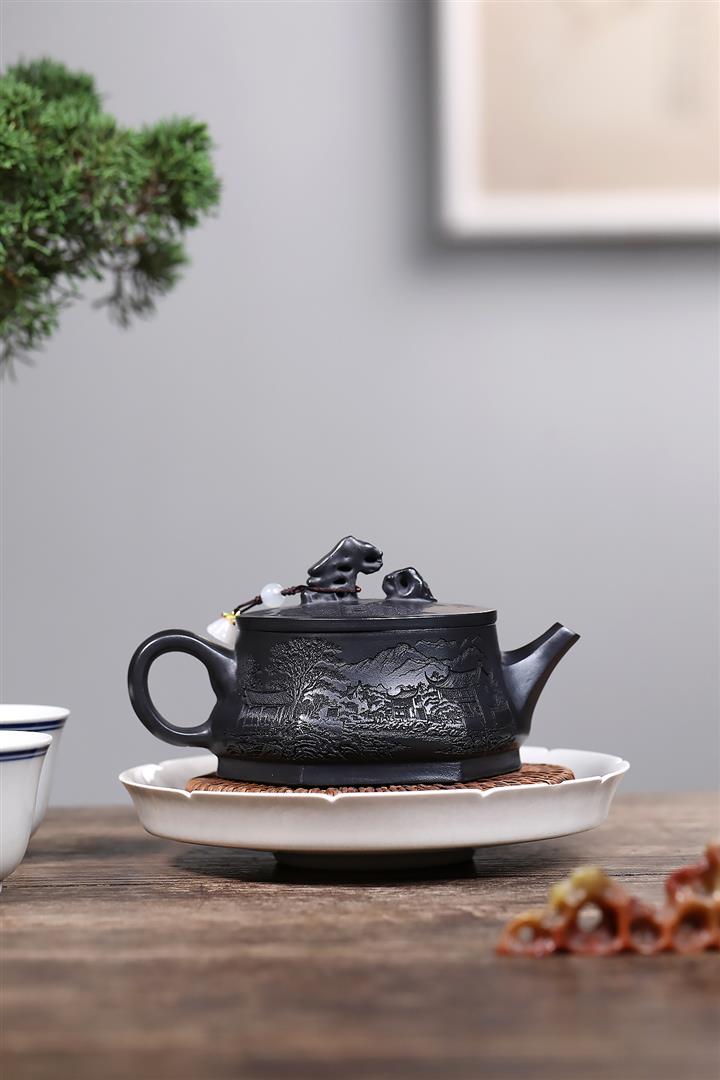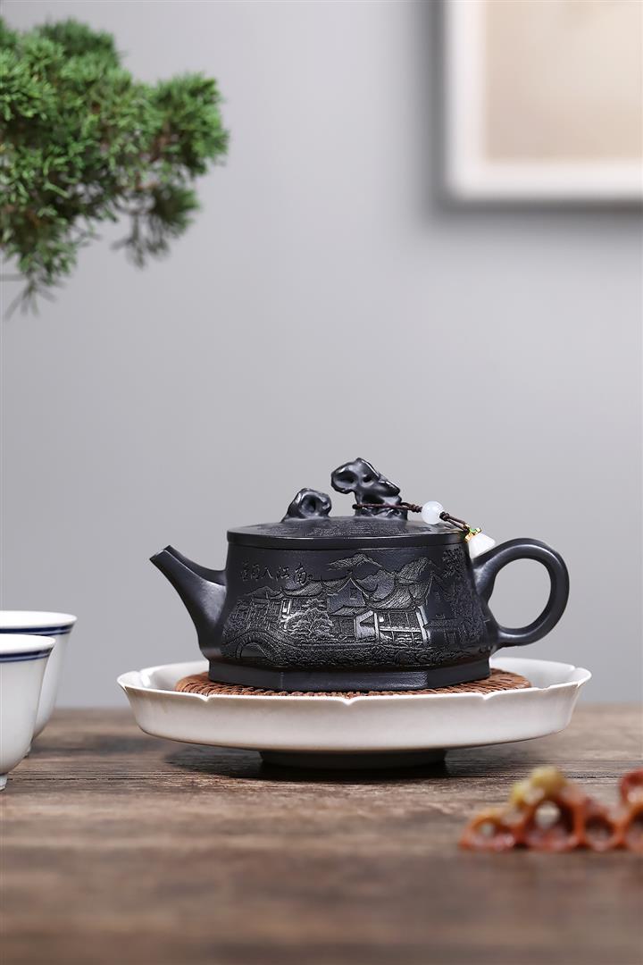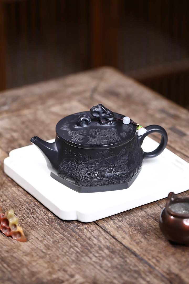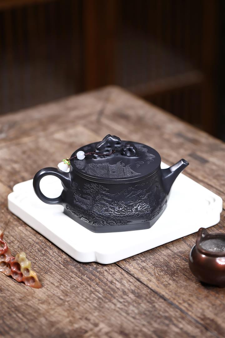 紫砂壺稀有翡翠綠泥六方漢鐸純手工刻繪POT3998
