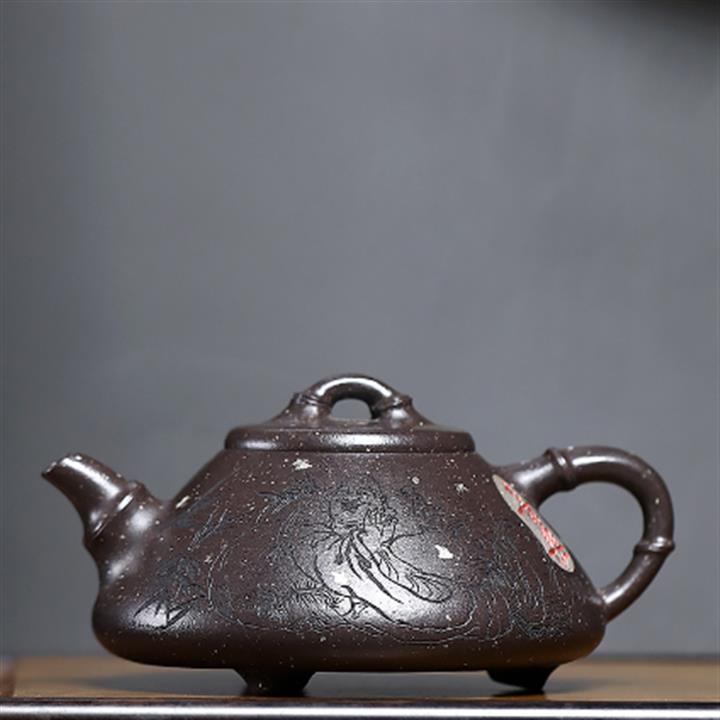 240cc描銀鋪砂雪花紫泥竹韻石瓢茶壺POT9040