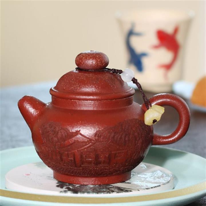 紫泥雙色粉漿手工泥繪江南山水茶蓋杯POT6853