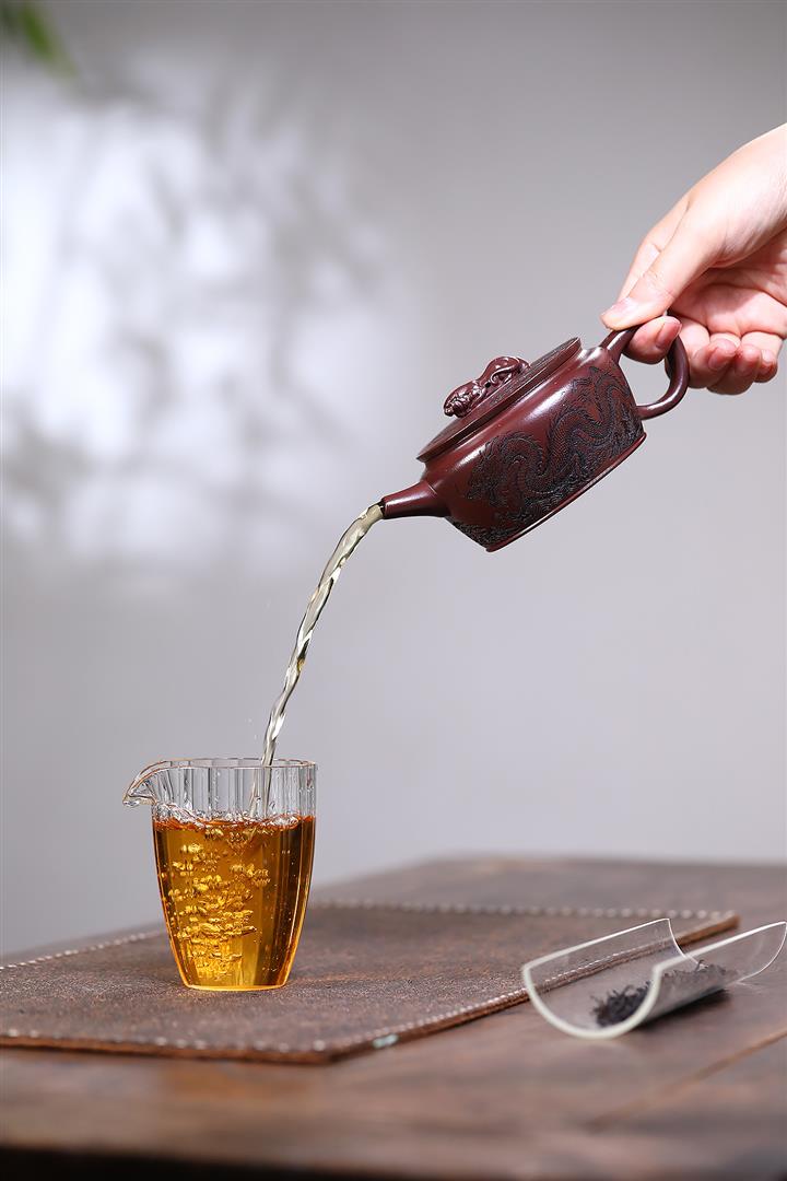【泥料特點】砂土氣重,似淳實農民,日久使用,漸露鋒芒,養成變化,溫潤莊重。紫砂是壹種雙重氣孔結構的多孔性材質,氣孔微細,密度高。用紫砂壺沏茶,不失原味,且香不渙散,得茶之真香真味。紫砂使用越久,壺身色澤越發光亮照人,氣韻溫雅。紫砂壺長久使用器身會因撫摸擦拭,變得越發溫潤光澤。