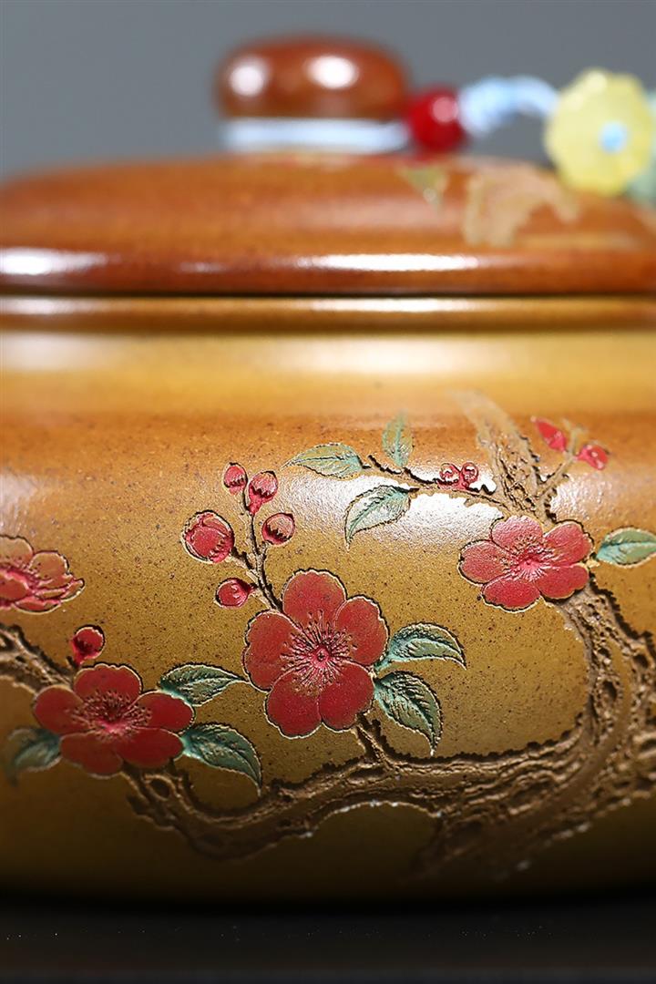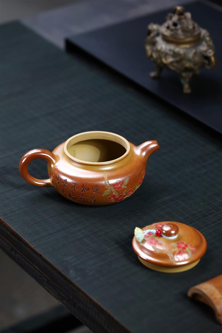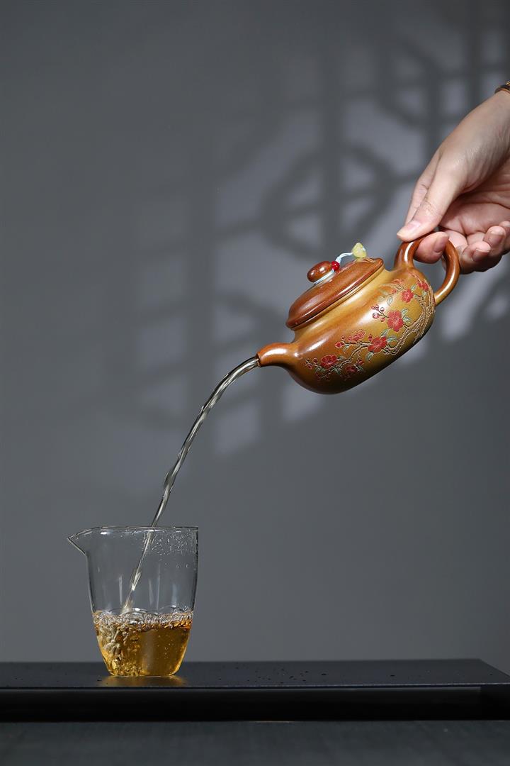 【泥料特點】砂土氣重,似淳實農民,日久使用,漸露鋒芒,養成變化,溫潤莊重。紫砂是壹種雙重氣孔結構的多孔性材質,氣孔微細,密度高。用紫砂壺沏茶,不失原味,且香不渙散,得茶之真香真味。紫砂使用越久,壺身色澤越發光亮照人,氣韻溫雅。紫砂壺長久使用器身會因撫摸擦拭,變得越發溫潤光澤。
