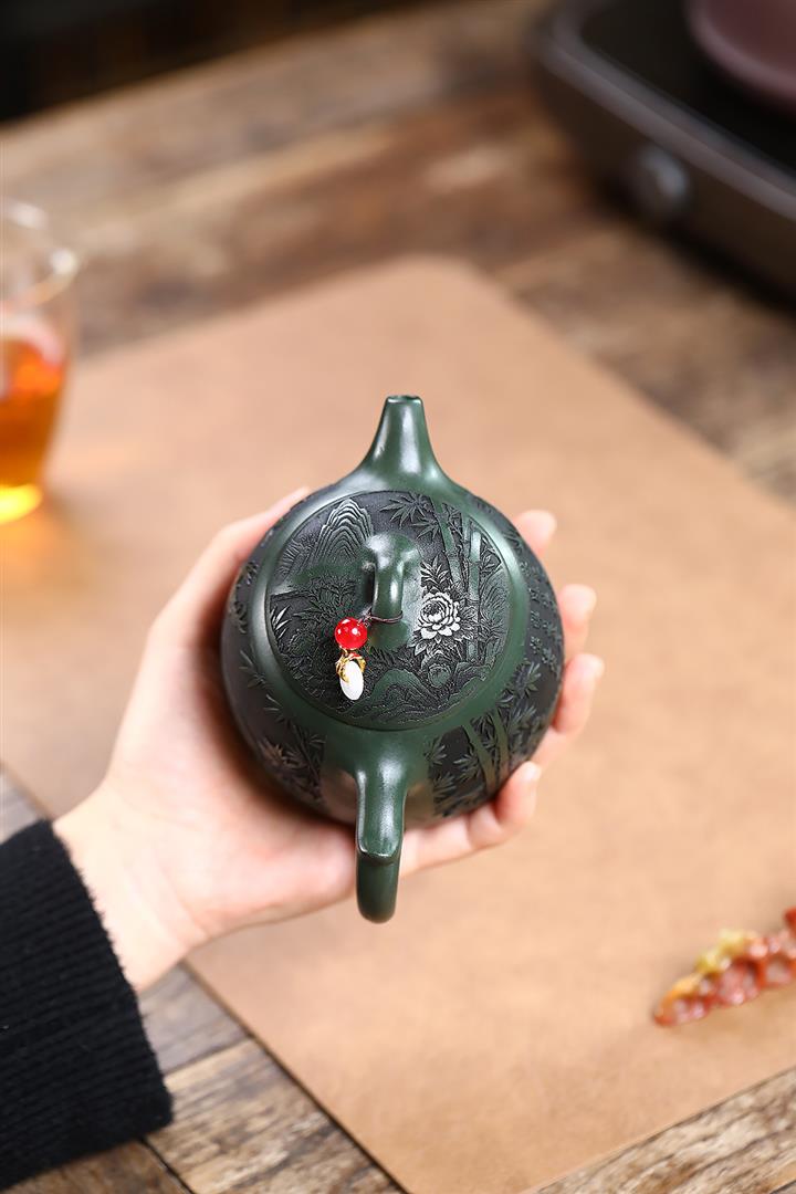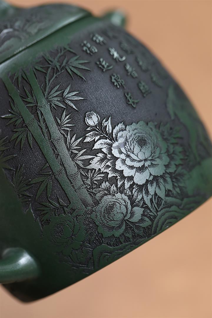 280cc原礦綠泥滿刻竹林松濤秦權茶壺POT8552