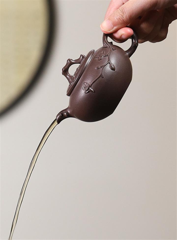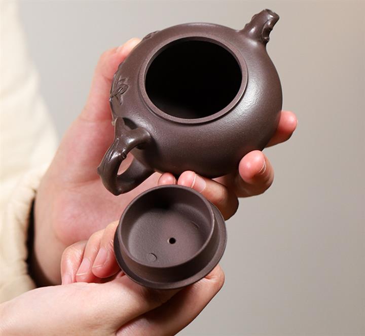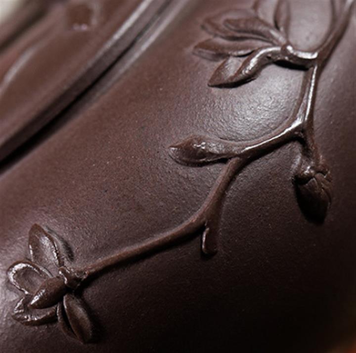 【泥料特點】砂土氣重,似淳實農民,日久使用,漸露鋒芒,養成變化,溫潤莊重。紫砂是壹種雙重氣孔結構的多孔性材質,氣孔微細,密度高。用紫砂壺沏茶,不失原味,且香不渙散,得茶之真香真味。紫砂使用越久,壺身色澤越發光亮照人,氣韻溫雅。紫砂壺長久使用器身會因撫摸擦拭,變得越發溫潤光澤。