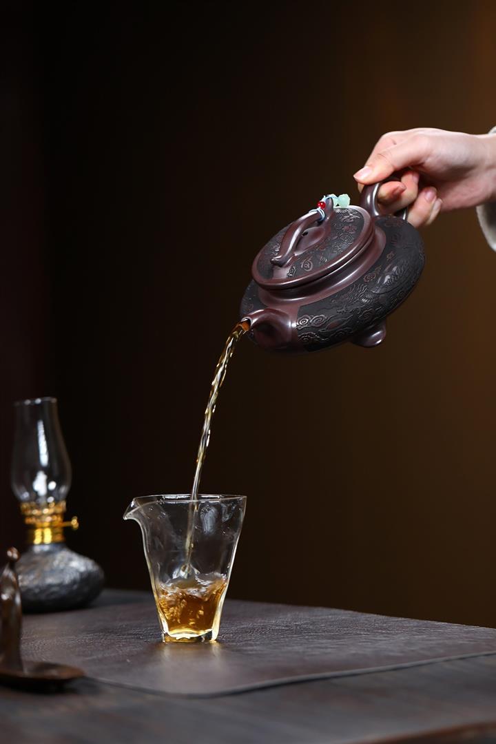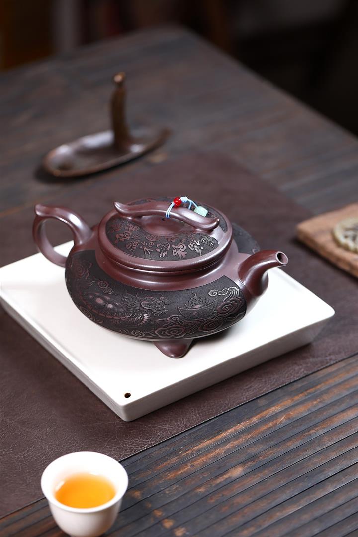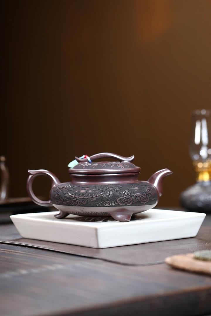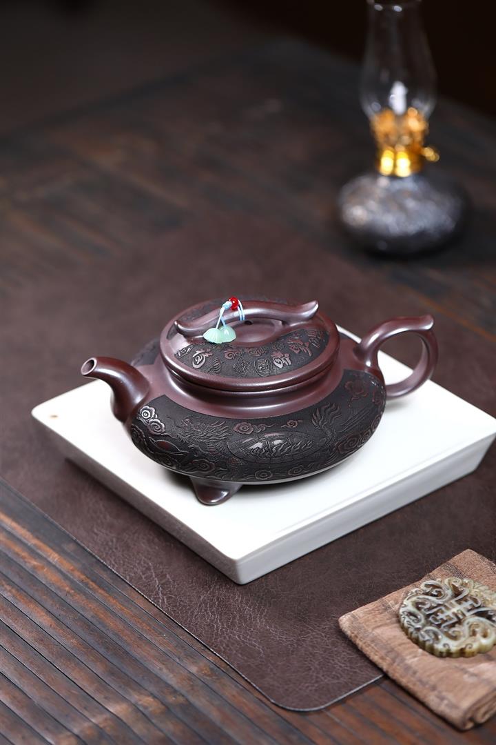 【泥料特點】砂土氣重,似淳實農民,日久使用,漸露鋒芒,養成變化,溫潤莊重。紫砂是壹種雙重氣孔結構的多孔性材質,氣孔微細,密度高。用紫砂壺沏茶,不失原味,且香不渙散,得茶之真香真味。紫砂使用越久,壺身色澤越發光亮照人,氣韻溫雅。紫砂壺長久使用器身會因撫摸擦拭,變得越發溫潤光澤。