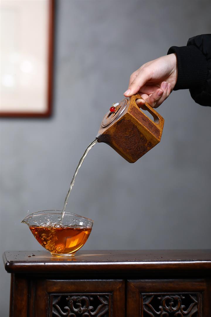 【泥料特點】砂土氣重,似淳實農民,日久使用,漸露鋒芒,養成變化,溫潤莊重。紫砂是壹種雙重氣孔結構的多孔性材質,氣孔微細,密度高。用紫砂壺沏茶,不失原味,且香不渙散,得茶之真香真味。紫砂使用越久,壺身色澤越發光亮照人,氣韻溫雅。紫砂壺長久使用器身會因撫摸擦拭,變得越發溫潤光澤。