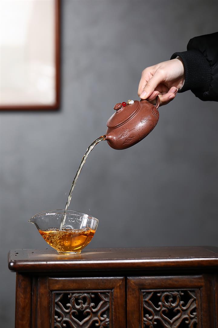 【泥料特點】砂土氣重,似淳實農民,日久使用,漸露鋒芒,養成變化,溫潤莊重。紫砂是壹種雙重氣孔結構的多孔性材質,氣孔微細,密度高。用紫砂壺沏茶,不失原味,且香不渙散,得茶之真香真味。紫砂使用越久,壺身色澤越發光亮照人,氣韻溫雅。紫砂壺長久使用器身會因撫摸擦拭,變得越發溫潤光澤。