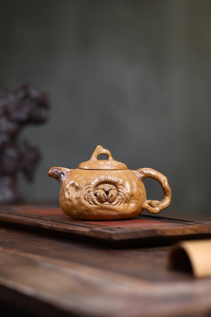 四方祥瑞手刻紫砂壺270cc pot3651
