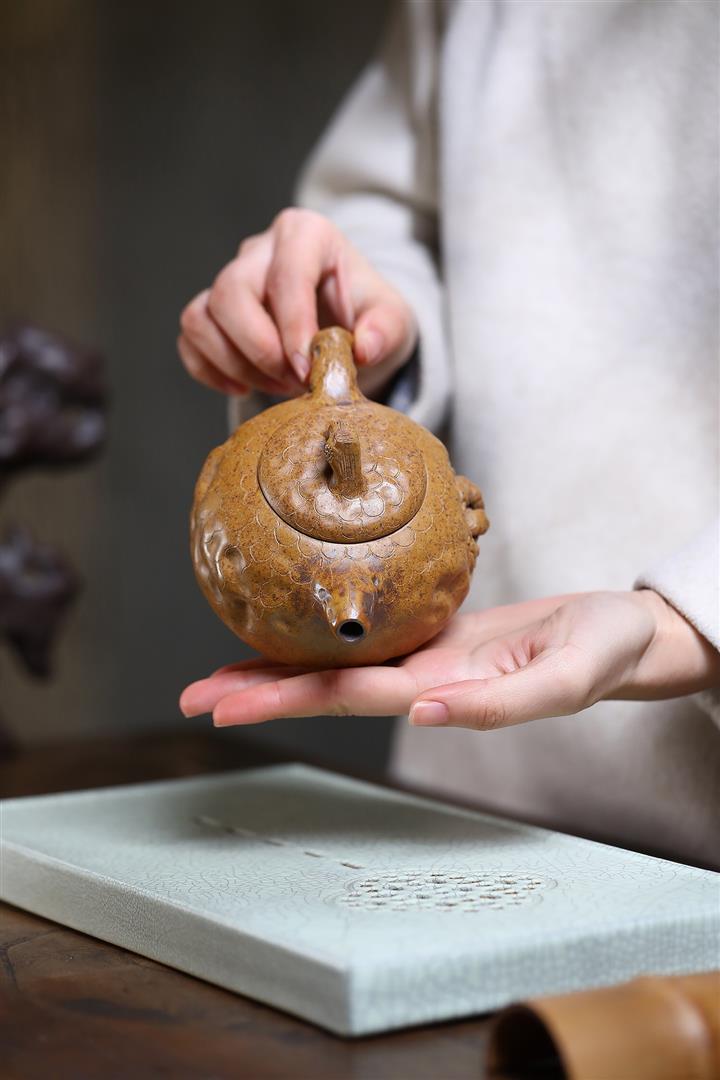 【泥料特點】砂土氣重,似淳實農民,日久使用,漸露鋒芒,養成變化,溫潤莊重。紫砂是壹種雙重氣孔結構的多孔性材質,氣孔微細,密度高。用紫砂壺沏茶,不失原味,且香不渙散,得茶之真香真味。紫砂使用越久,壺身色澤越發光亮照人,氣韻溫雅。紫砂壺長久使用器身會因撫摸擦拭,變得越發溫潤光澤。