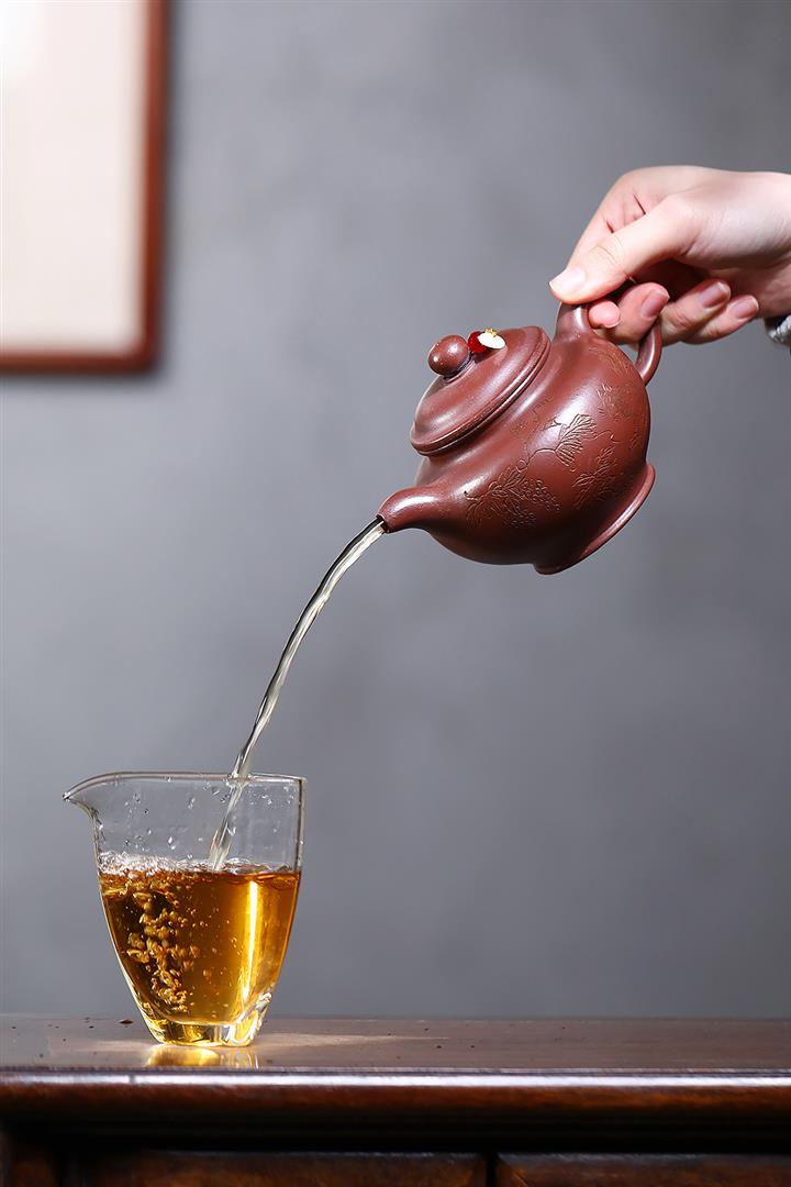 【泥料特點】砂土氣重,似淳實農民,日久使用,漸露鋒芒,養成變化,溫潤莊重。紫砂是壹種雙重氣孔結構的多孔性材質,氣孔微細,密度高。用紫砂壺沏茶,不失原味,且香不渙散,得茶之真香真味。紫砂使用越久,壺身色澤越發光亮照人,氣韻溫雅。紫砂壺長久使用器身會因撫摸擦拭,變得越發溫潤光澤。
