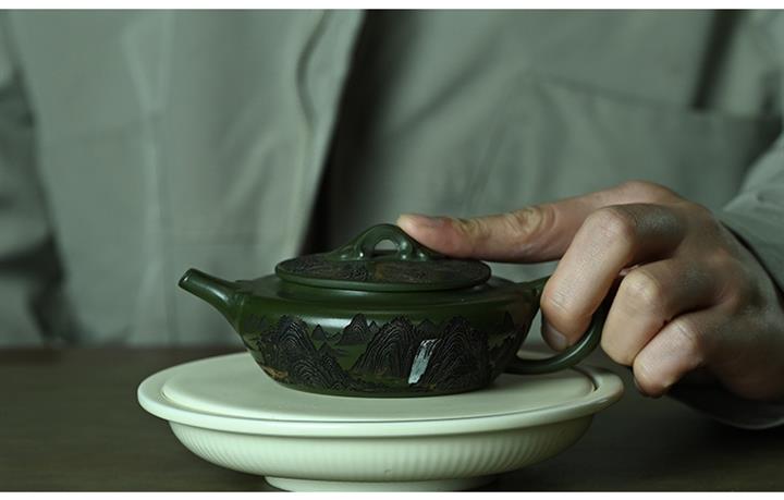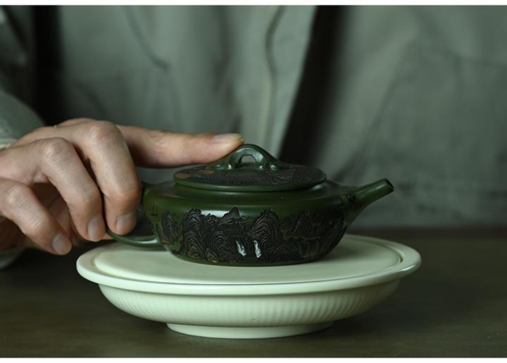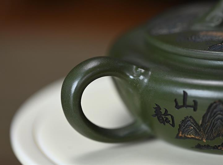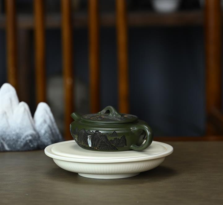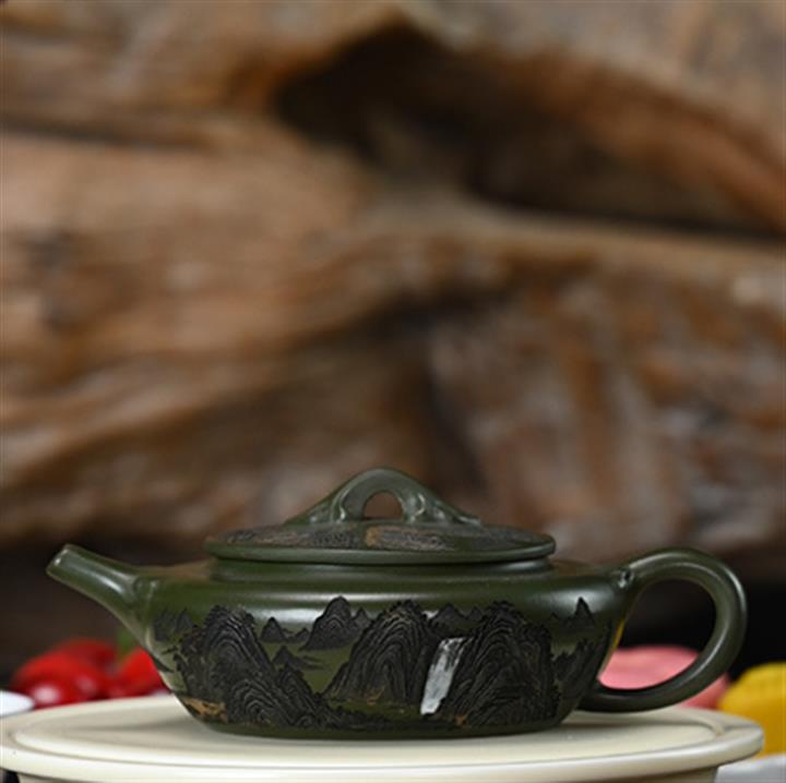 190cc原礦綠泥刻繪山水扁晨泡茶壺POT9548