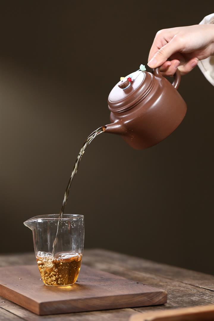 【泥料特點】砂土氣重,似淳實農民,日久使用,漸露鋒芒,養成變化,溫潤莊重。紫砂是壹種雙重氣孔結構的多孔性材質,氣孔微細,密度高。用紫砂壺沏茶,不失原味,且香不渙散,得茶之真香真味。紫砂使用越久,壺身色澤越發光亮照人,氣韻溫雅。紫砂壺長久使用器身會因撫摸擦拭,變得越發溫潤光澤。