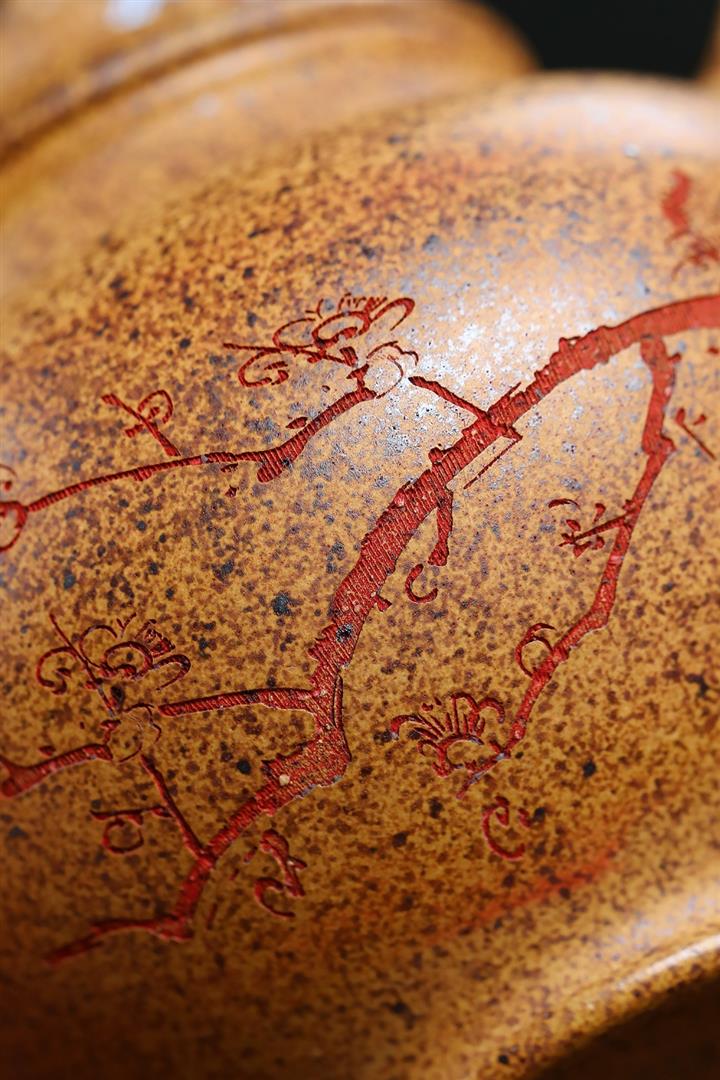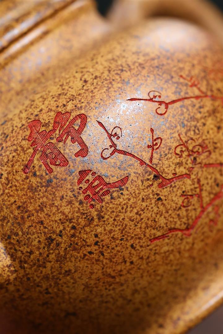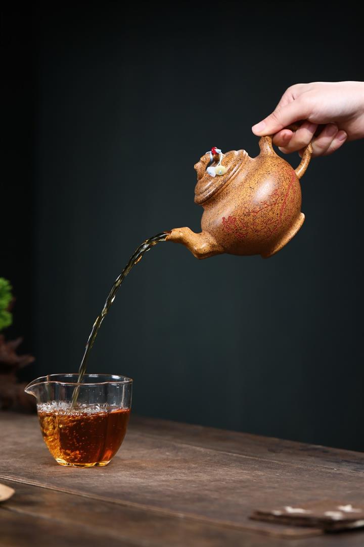 【泥料特點】砂土氣重,似淳實農民,日久使用,漸露鋒芒,養成變化,溫潤莊重。紫砂是壹種雙重氣孔結構的多孔性材質,氣孔微細,密度高。用紫砂壺沏茶,不失原味,且香不渙散,得茶之真香真味。紫砂使用越久,壺身色澤越發光亮照人,氣韻溫雅。紫砂壺長久使用器身會因撫摸擦拭,變得越發溫潤光澤。