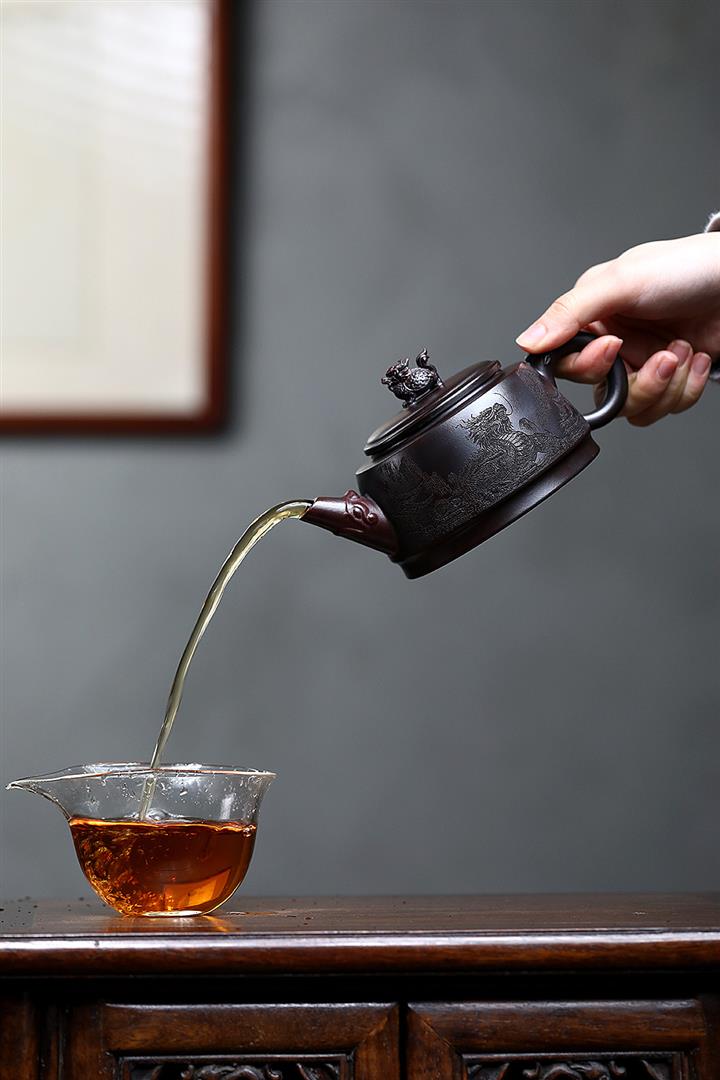 【作品介紹】此款壺形線條流暢,壺把,壺嘴,壺身壹氣呵成栩栩如生,是收藏把玩的好壺,泥料色澤古樸典雅,日久使用,漸露鋒芒,養成變化快,溫潤莊重,用其泡茶,使用的年代久,壺身就溫潤,泡出來的茶湯也就醇郁芳馨。
