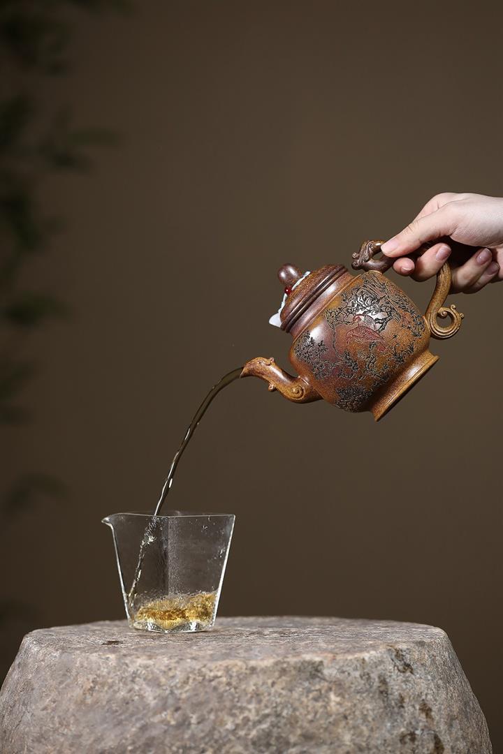 【泥料特點】砂土氣重,似淳實農民,日久使用,漸露鋒芒,養成變化,溫潤莊重。紫砂是壹種雙重氣孔結構的多孔性材質,氣孔微細,密度高。用紫砂壺沏茶,不失原味,且香不渙散,得茶之真香真味。紫砂使用越久,壺身色澤越發光亮照人,氣韻溫雅。紫砂壺長久使用器身會因撫摸擦拭,變得越發溫潤光澤。